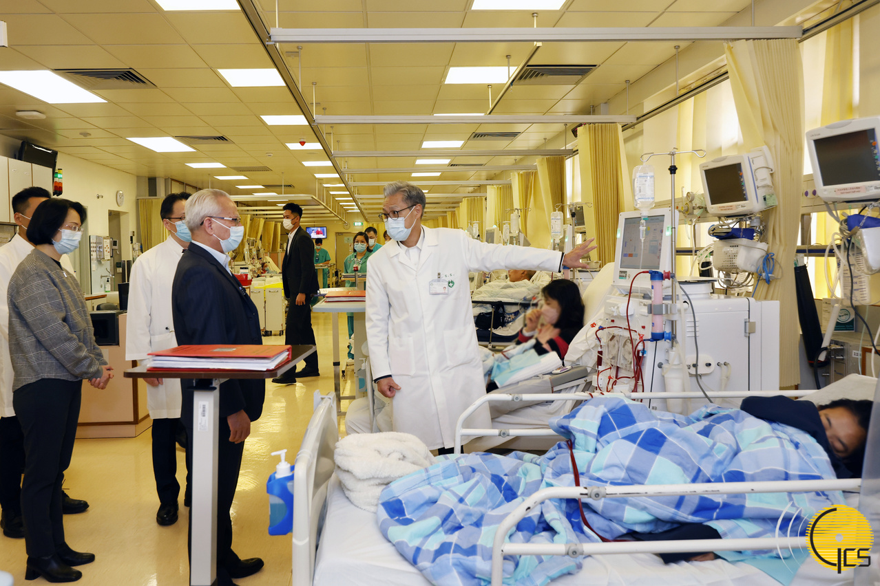 行政長官岑浩輝在醫院血液透析室與醫護人員交談,感謝他們堅守崗位。