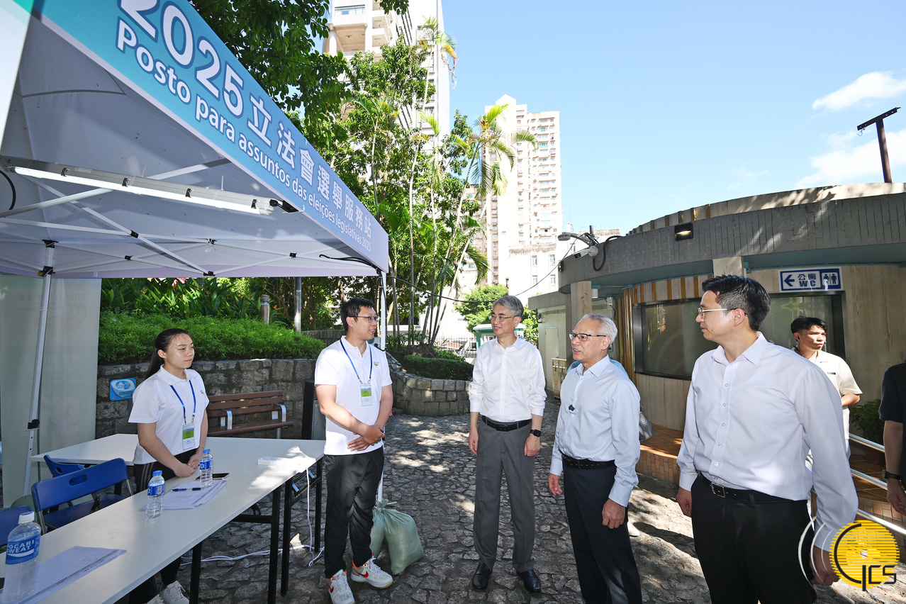 行政長官岑浩輝步行至鮑思高粵華小學投票站附近的螺絲山公園選舉服務站,關心工作人員的工作及輪休情況。