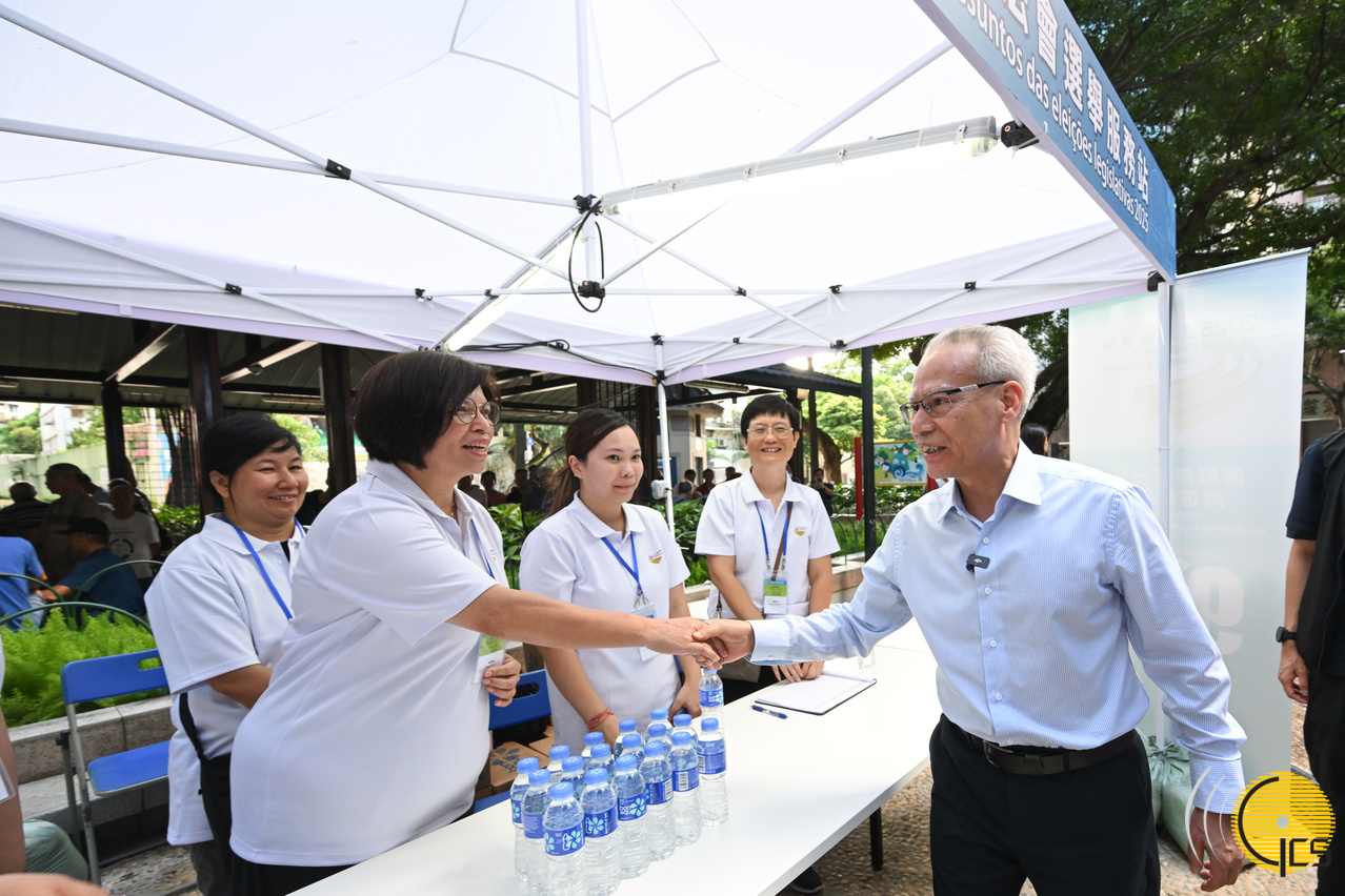 行政長官岑浩輝到三角花園選舉服務站,與工作人員親切握手,為他們打氣加油。
