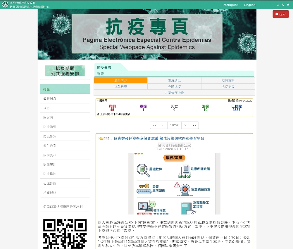 截至4月10日,透過專頁發佈有關疫情的新聞、快訊、圖文包等訊息超過2,400條,另外還有各種抗疫相關的宣傳和衛生教育短片;保障口罩供應澳門居民計劃的即時統計亦上載到專頁上,方便居民規劃購買口罩的行程。與此同時,新聞局主動配合不同讀者群,透過手機應用程式、微信、Facebook和Telegram等社交媒體和即時通訊軟件,發出超過2,500則帖文,加上網上直播,精準推送訊息,期望達至滴水不漏的發佈效果,為公眾提供及時、準確、齊備而且深入的抗疫訊息。