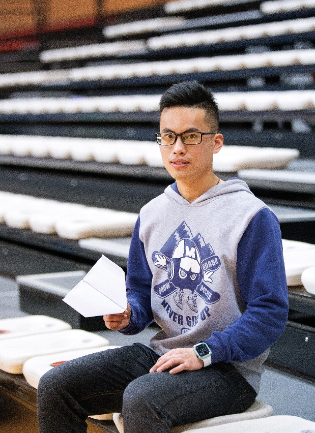 現就讀於培正中學高中二年級的Dennis,也被紙飛機迷住了。Dennis於初中校內比賽獲得佳績後,便大膽挑戰2018年「衝上雲霄」大賽,於中學組別的飛行距離最遠團體賽及花式飛行個人賽中摘銅,次年更進一步,於同賽事中學組別問鼎飛行距離最遠個人賽及花式飛行個人賽冠軍,亦在飛行時間最長團體賽中拿下亞軍。Dennis於飛行距離最遠個人賽中擲飛出46.562米的好成績,這一紀錄,放諸世界的飛行距離賽中,亦毫不遜色。