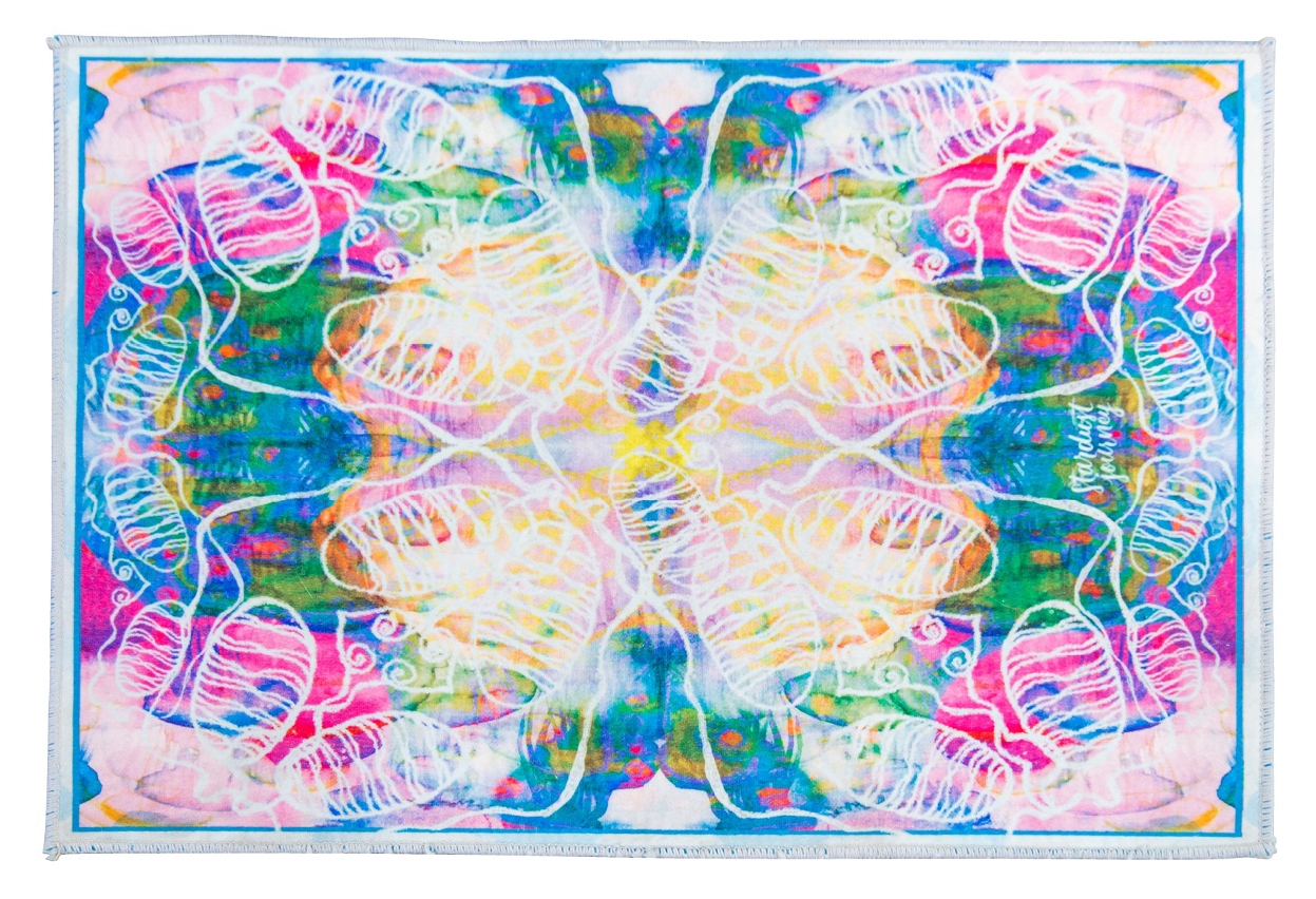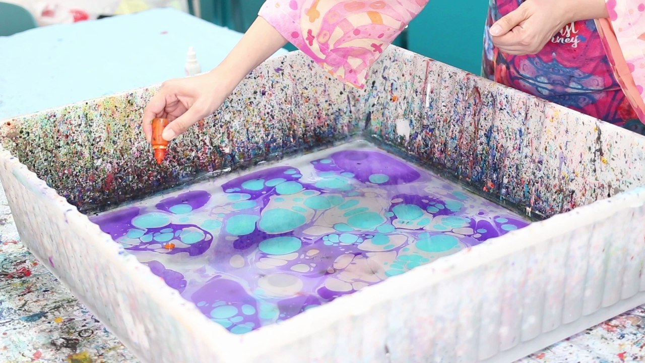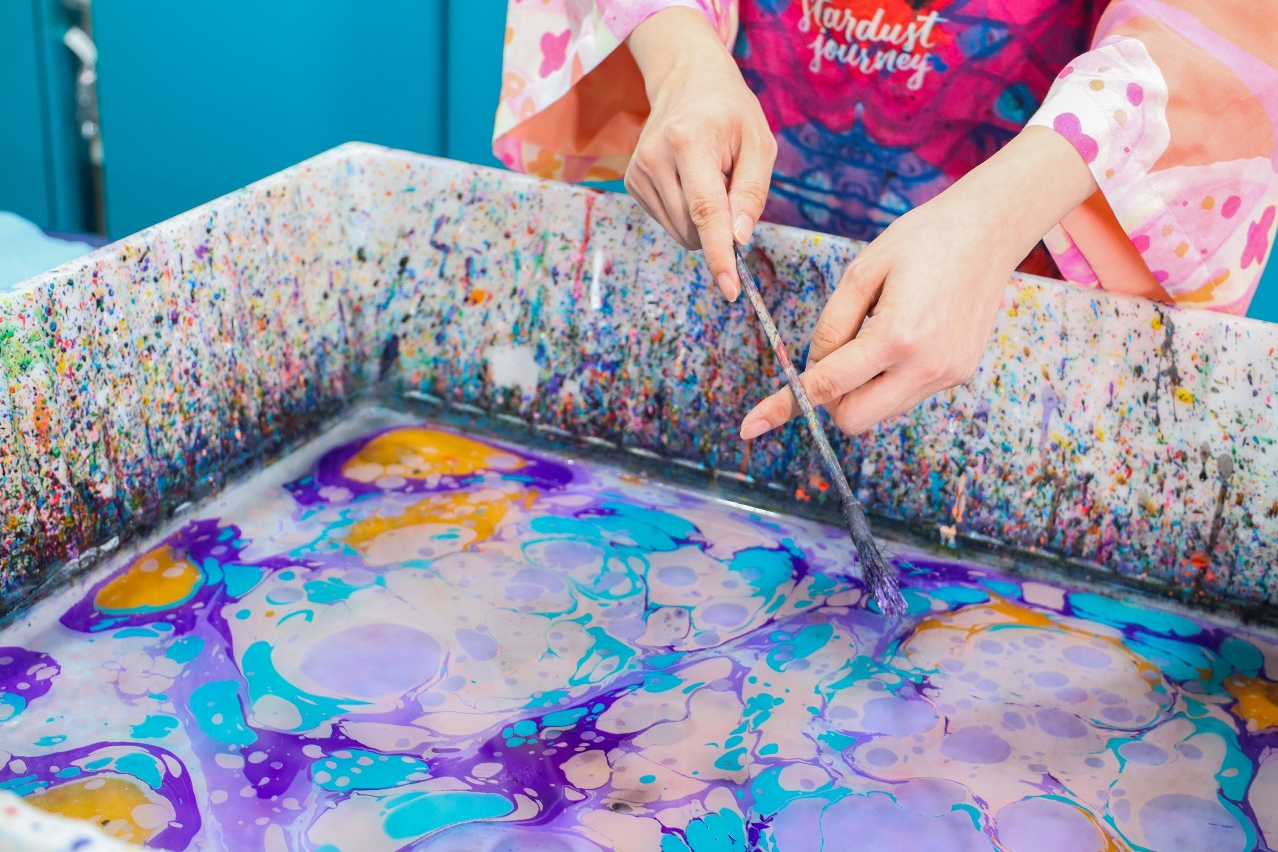 她詳細解釋,土耳其浮水畫是以水為「紙」,即在水上作畫。首先要調配出浮水畫的水膠液,即在水中加入如海藻粉等黏性粉類,靜置12小時,使其充份完成化學反應,水和顏料就會分層;再使用水溶性顏料滴入水膠液上,顏料隨着水波自然擴散。此時,可運用畫筆沾染顏料,星星點點撒在水上,再用畫錐等工具,在水面上勾畫出喜歡的形狀;最後,就是拓印的部份,將畫紙擺平覆蓋在水上,吸取顏料,然後再將畫紙慢慢抽離水面,形成畫作。「浮水畫的載體十分豐富,只要能夠吸水的物件都能拓印花紋,包括絲巾、皮具、布料等。」