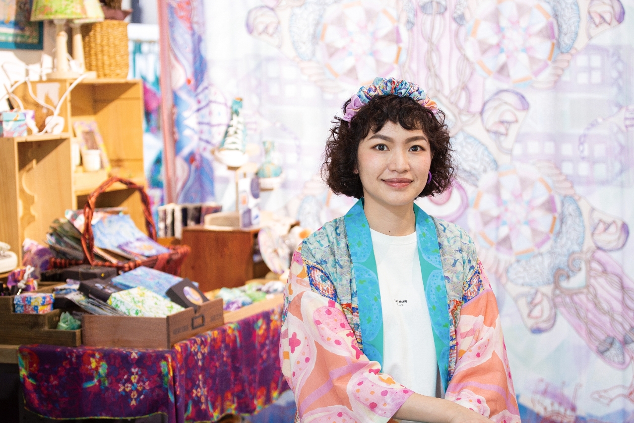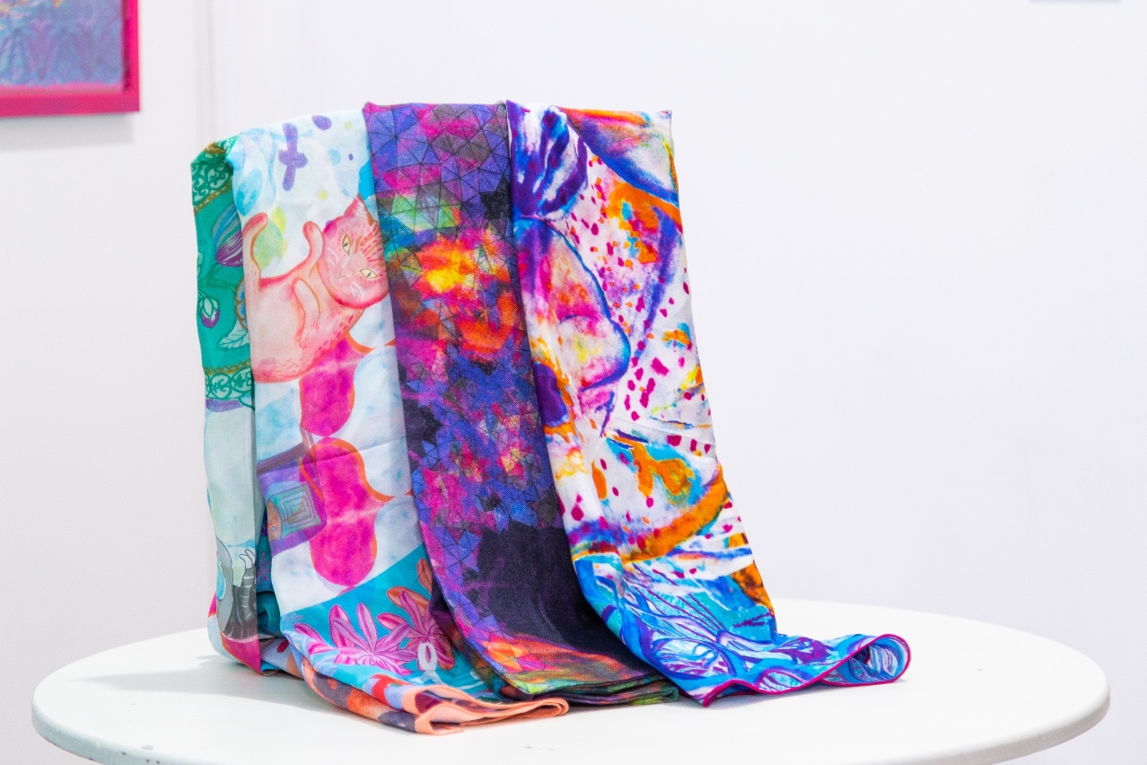 走進Stardust Journey店,室內裝潢以藍色為基調,擁有寬闊挑高的空間感,牆上掛着多幅鑲框的絲巾作品,不論裝潢還是店內擺設都相當有風格。店舖中間以一塊大型掛簾分隔為兩個空間,前面的空間用作產品展示及銷售,後面則是安志穎進行創作及舉辦工作坊的地方,可容納6至8人。