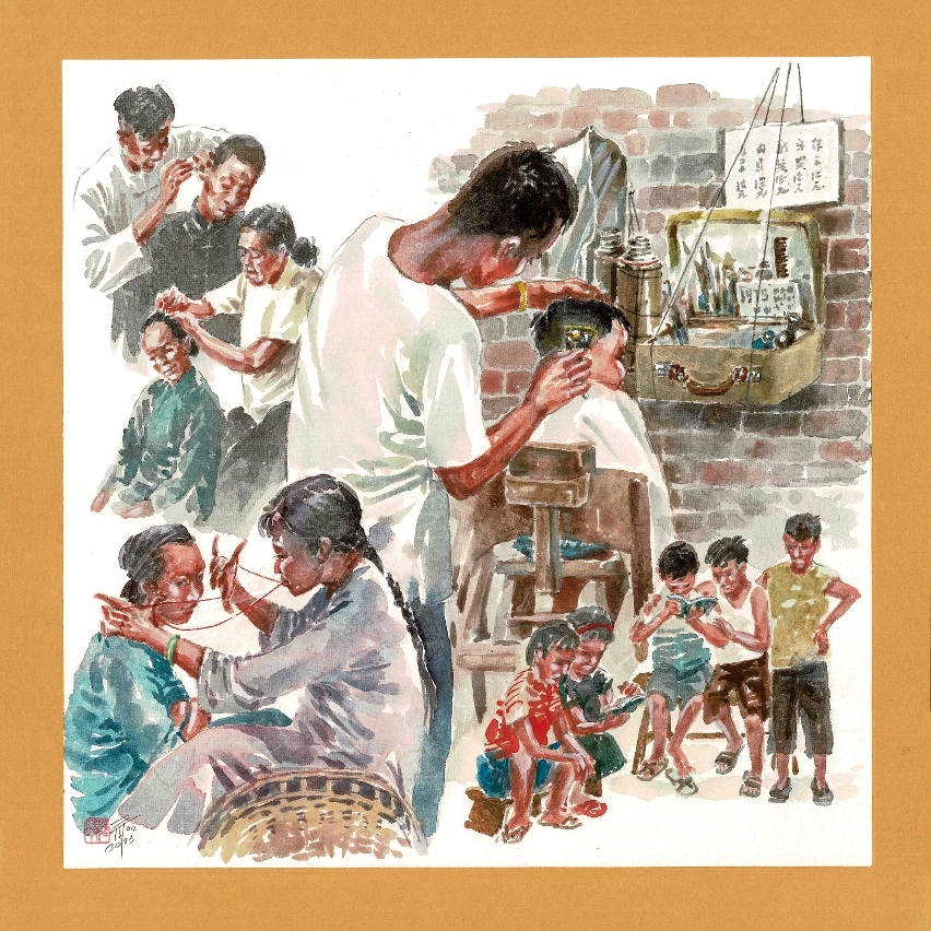 來梳頭的客人多半要求同時做絞面。絞面是中國古傳的美容手藝,又稱開面、線面,「梳頭婆」多兼善此法。