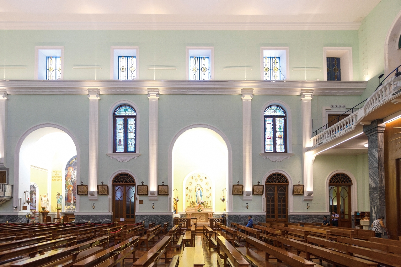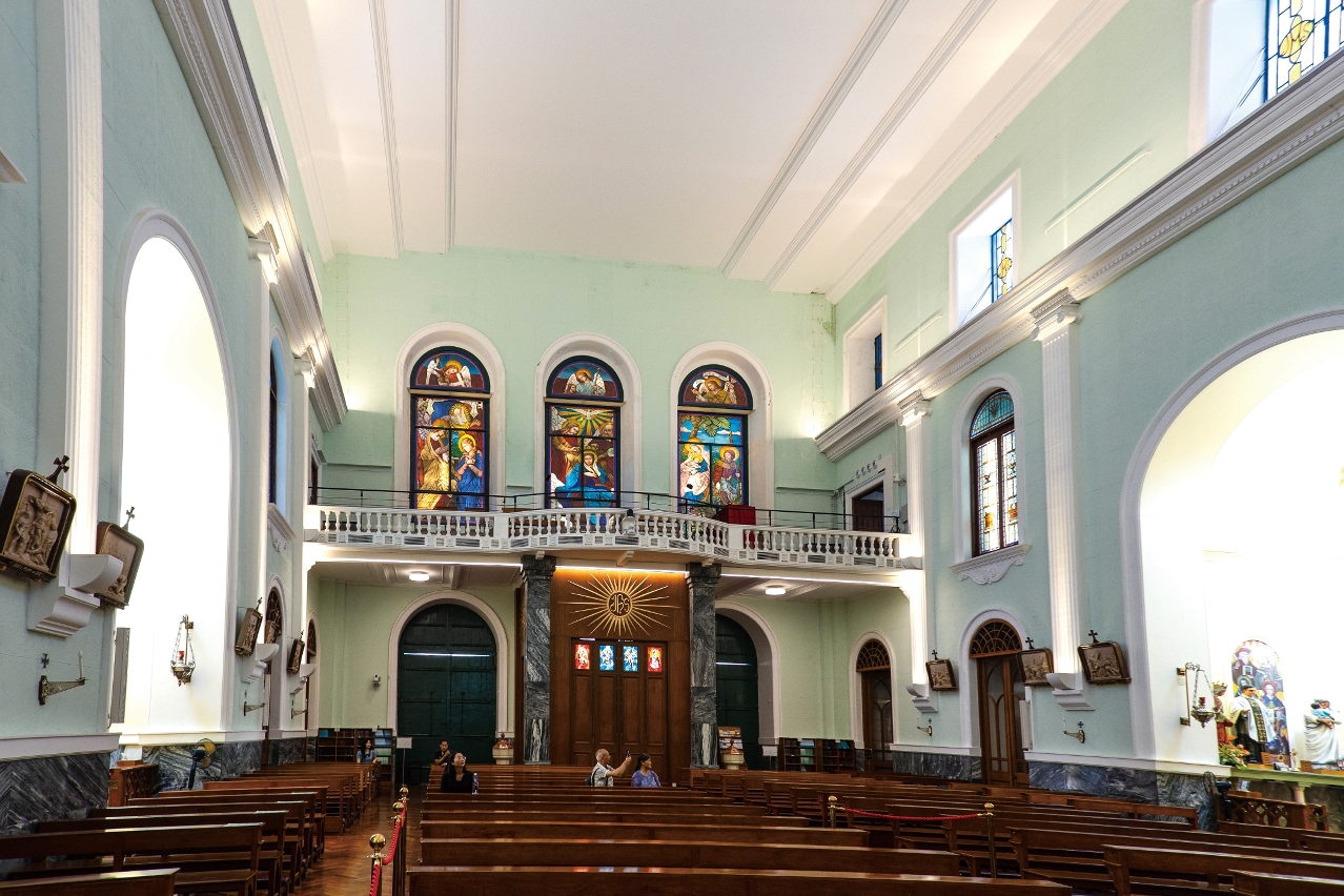 教堂主殿為矩形平面,是當時全澳最闊大的教堂空間,其中最古老的耳堂採用木拱頂,供奉貞節聖母。主祭壇空間深遠,設計簡單,僅以彩色玻璃窗為背景。祭壇下面埋藏着16和17世紀的主教和聖徒遺骨,為教堂增添宗教的榮光。主殿與主祭室之間由一個大型羅馬圓拱門分隔,造型參考凱旋門,隱喻基督的勝利。
