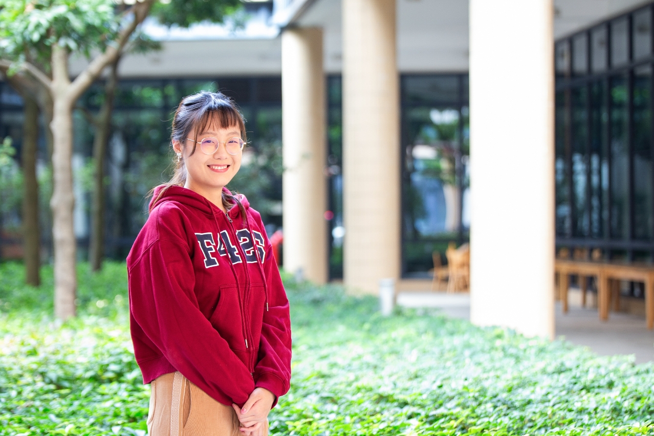 詹睿欣有一雙總是笑瞇瞇的眼睛,現實中也是一個樂觀開朗的女孩。她參加拍攝時是大一新生,「參與《白夜》拍攝,讓我一入學就感受到澳門大學豐富的校園生活,也幫助我快速融入新環境。」雖然沒有任何表演經驗,但劇組中洋溢的自在、寬容氛圍,對她融入角色有很大幫助。「這部電影經常需要在同一個場景出現『女主角』的兩面,需要我和陳嘉嘉輪流拍攝,或做對手戲,展現角色兩面的對抗與掙扎。拍攝時,導演給了我們很大的發揮空間,很多時會讓我們即興構思對白,很好玩。」