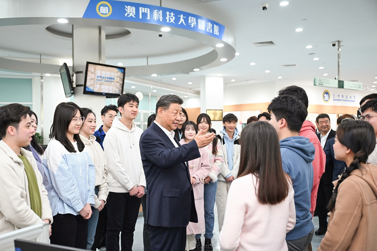 隨後,習近平來到學校圖書館,參觀「全球地圖中的澳門」粵港澳大灣區與澳門古地圖展,察看館藏珍貴書籍。看到習主席的到來,正在查閱資料的同學們十分激動。習近平向大家詳細詢問學習專業、研究領域和生活情況等,勉勵同學們珍惜寶貴的學習時光,多汲取有益的知識,讓網絡資源成為學習和科研的好幫手。圖書館大廳裡,掌聲熱烈,科研人員、在校師生高聲向習近平主席問好。習近平說:「看到澳門教育興旺,大家朝氣蓬勃、充滿自信,我感到很高興。要始終從戰略高度重視教育,緊緊圍繞國家和澳門發展的需求佈局學科體系、培養高素質人才。希望你們樹立遠大理想,與祖國共命運、與時代同步伐,實現自己的人生價值。祝願並相信澳門科技大學明天會更好,澳門明天會更好。」