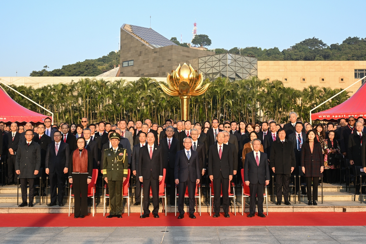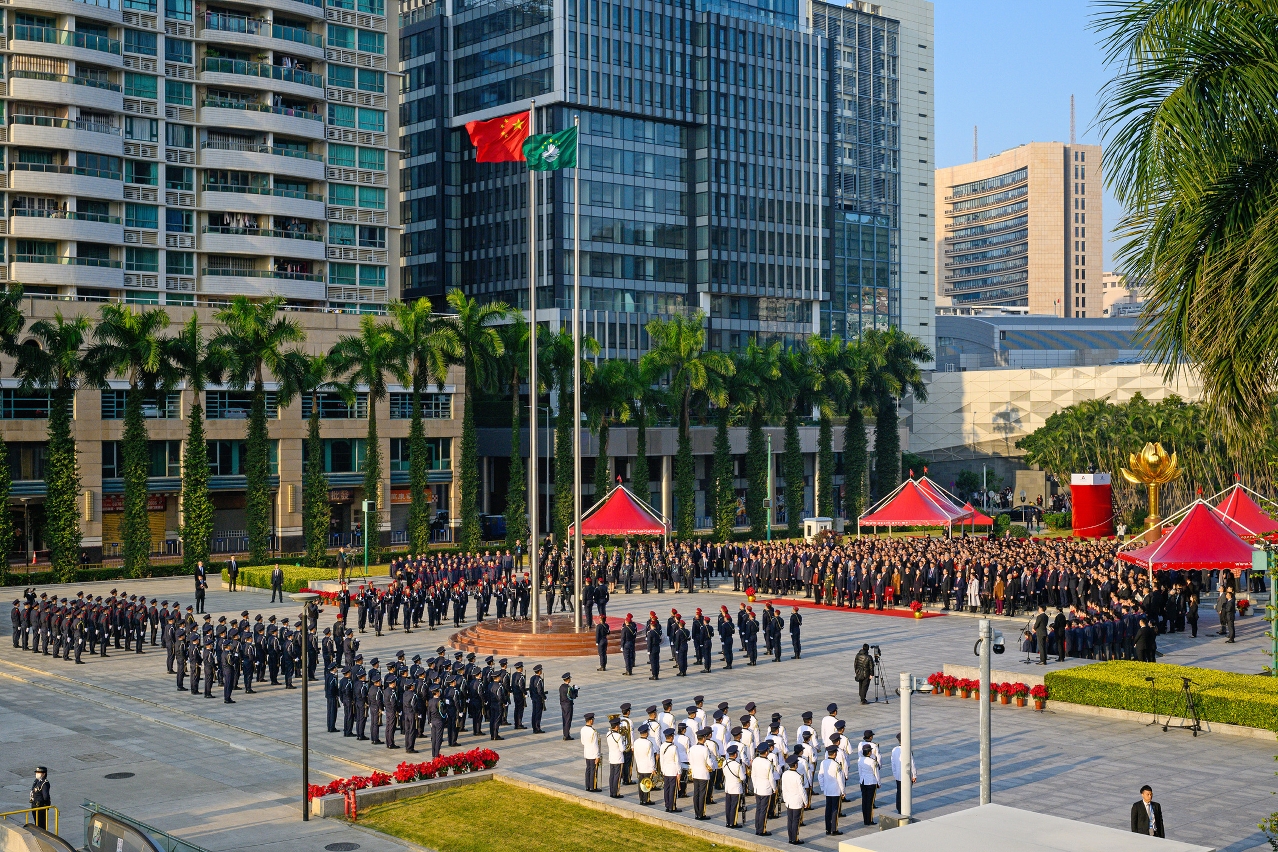 2024年12月20日早上8時,澳門特別行政區政府在金蓮花廣場舉行升旗儀式。升旗儀式由行政長官岑浩輝主持,中央人民政府駐澳機構負責人、澳門特區立法及司法機關負責人、行政會委員、立法議員、特區政府官員、澳區人大代表、政協委員及社會各界人士等約740人參加。場外,不少居民及旅客前來觀禮,感受升旗儀式莊嚴氣氛。