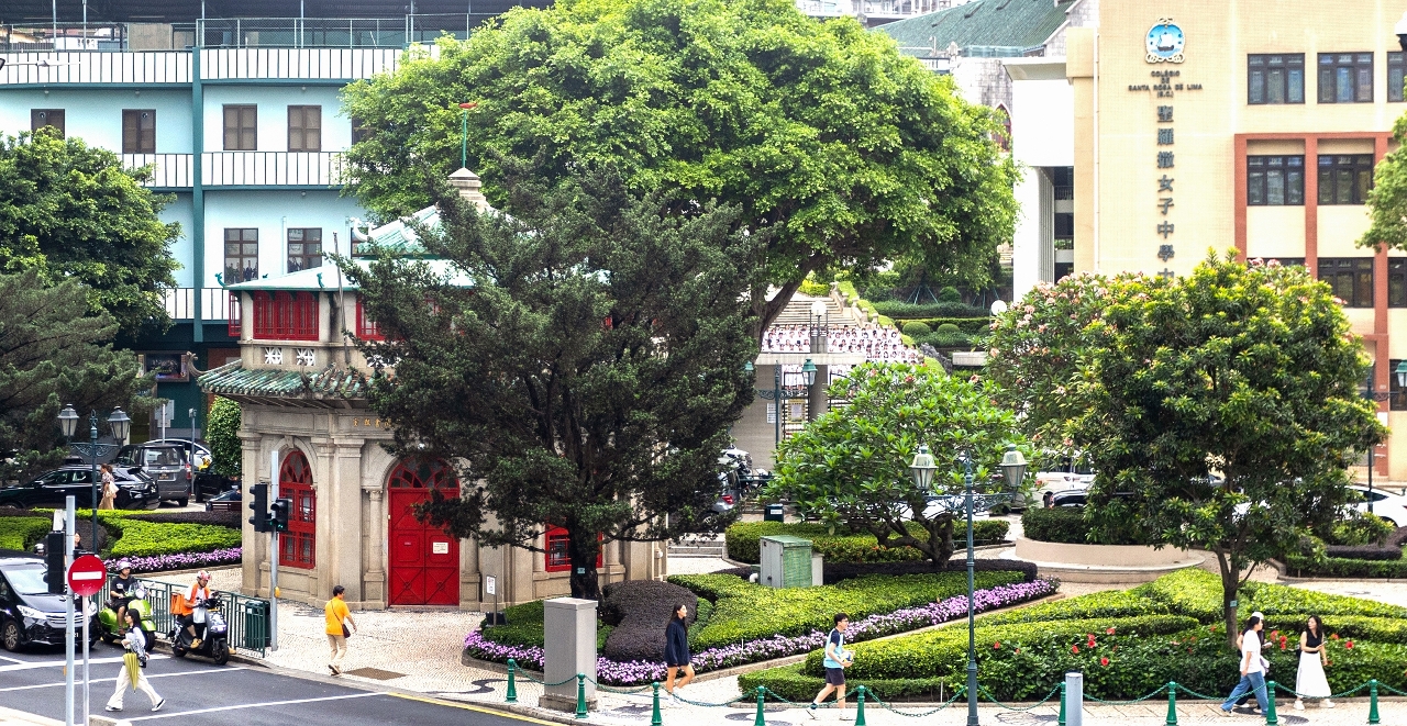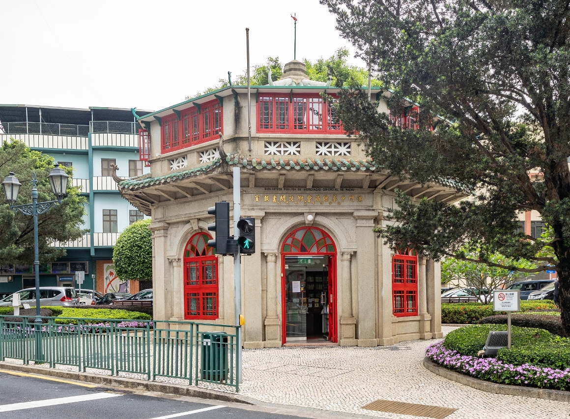 從水坑尾轉入南灣大馬路,在街角的花園中有一座俗稱「八角亭」的小型建築物,它是澳門中華總商會開設的小型閱書樓,究竟,這座小建築物有甚麼歷史?具有甚麼建築特色?