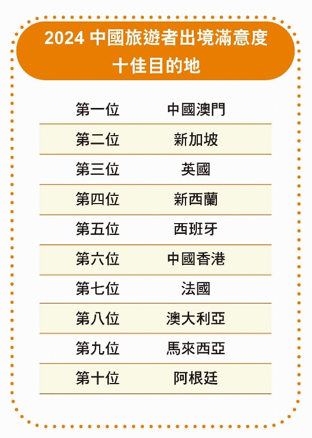 根據中國旅遊研究院公佈的「2024中國旅遊者出境滿意度十佳目的地」,澳門首次位列榜首,尤其在「娛樂休閒」及「當地居民態度」方面獲得高度評價。澳門獲得是次佳績,是社會各界共同努力的成果,致力為旅客營造良好旅遊體驗及友好氛圍,展現有禮都市形象,鞏固「世界旅遊休閒中心」的地位,吸引更多世界各地的旅客前來「感受澳門」。