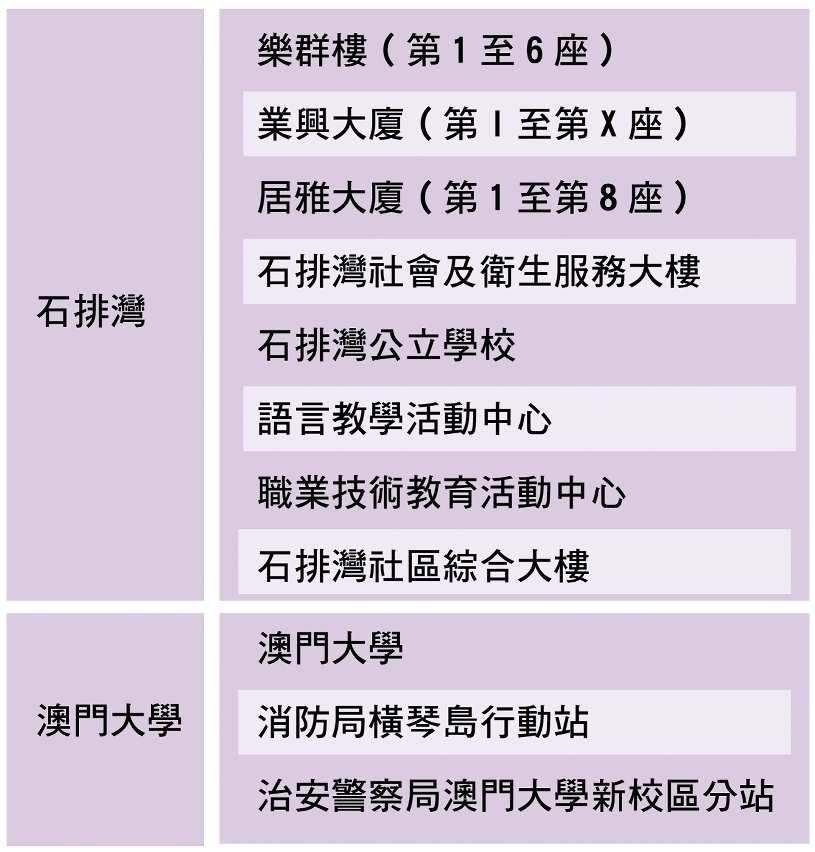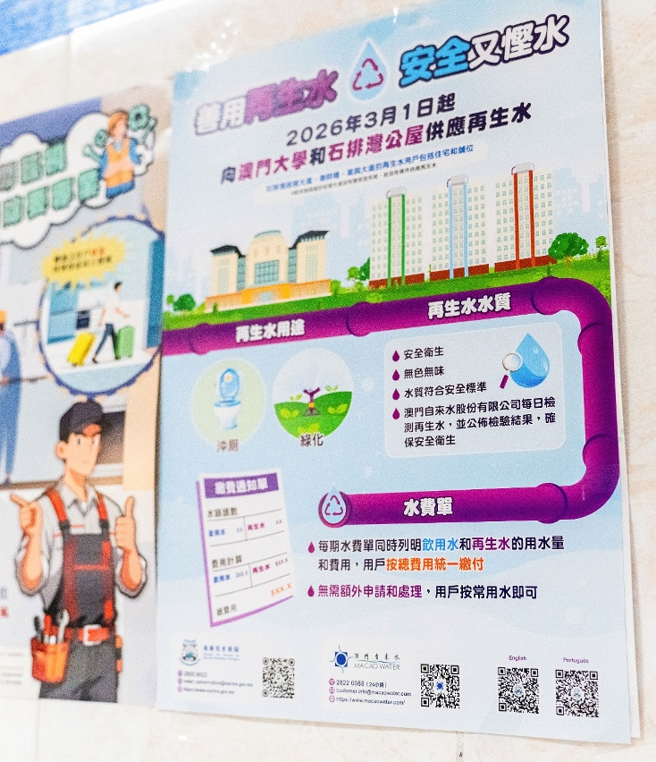 海事及水務局計劃由2026年3月1日起向石排灣公屋及澳門大學供應再生水,作沖廁和綠化用途。獲供應再生水的樓宇包括 :