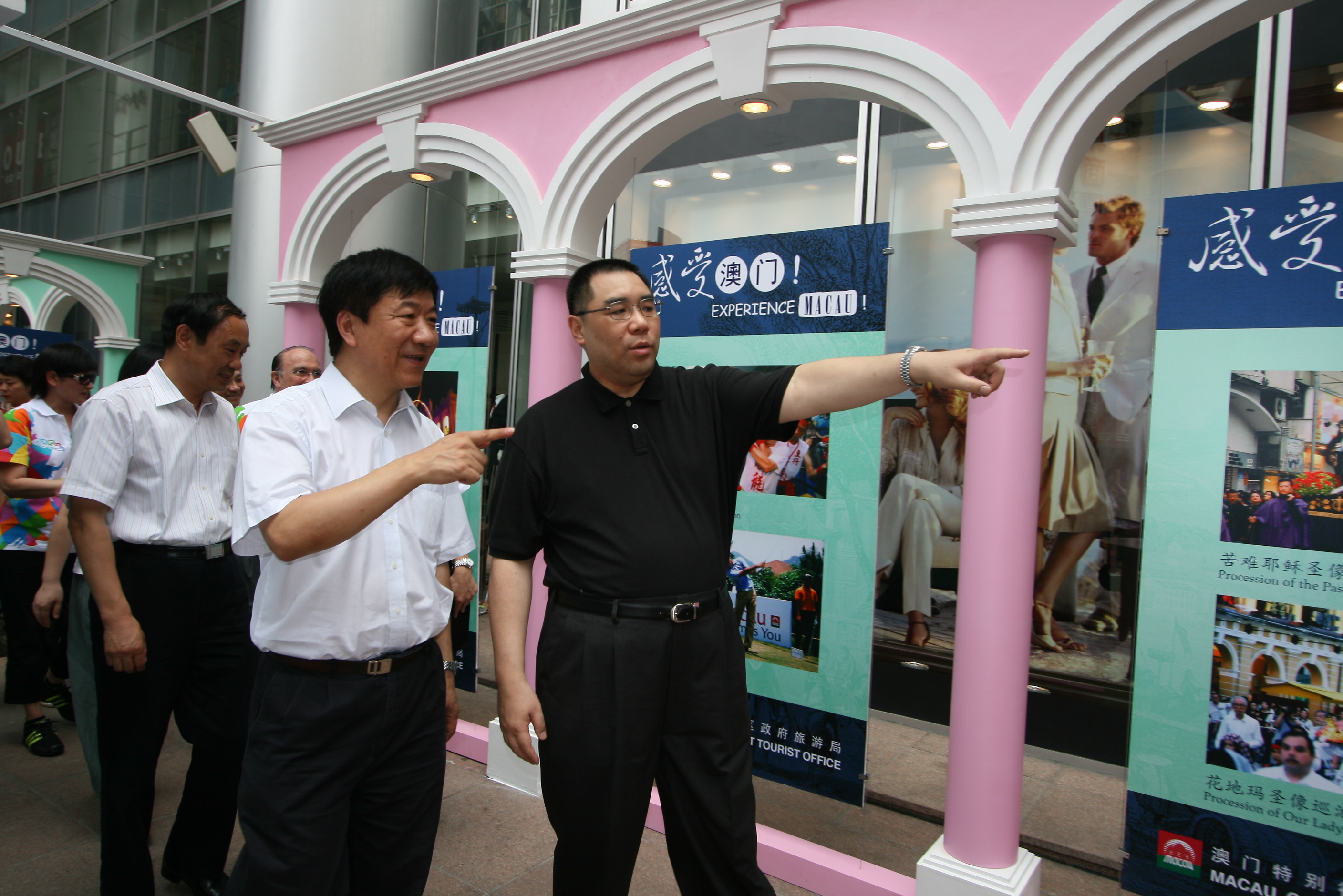 繼日前在上海舉行的“上海 - 澳門旅遊業界洽談會”及“上海 - 澳門旅遊論壇”後,澳門旅遊局昨天中午在上海百年世茂國際廣場的露天廣場舉行「感受澳門」路展開幕儀式,社會文化司司長崔世安、上海市政府副秘書長姚明寶、社會文化司司長辦公室主任譚俊榮及澳門特區政府旅遊局局長安棟樑為「感受澳門」路展主持醒獅點睛儀式。