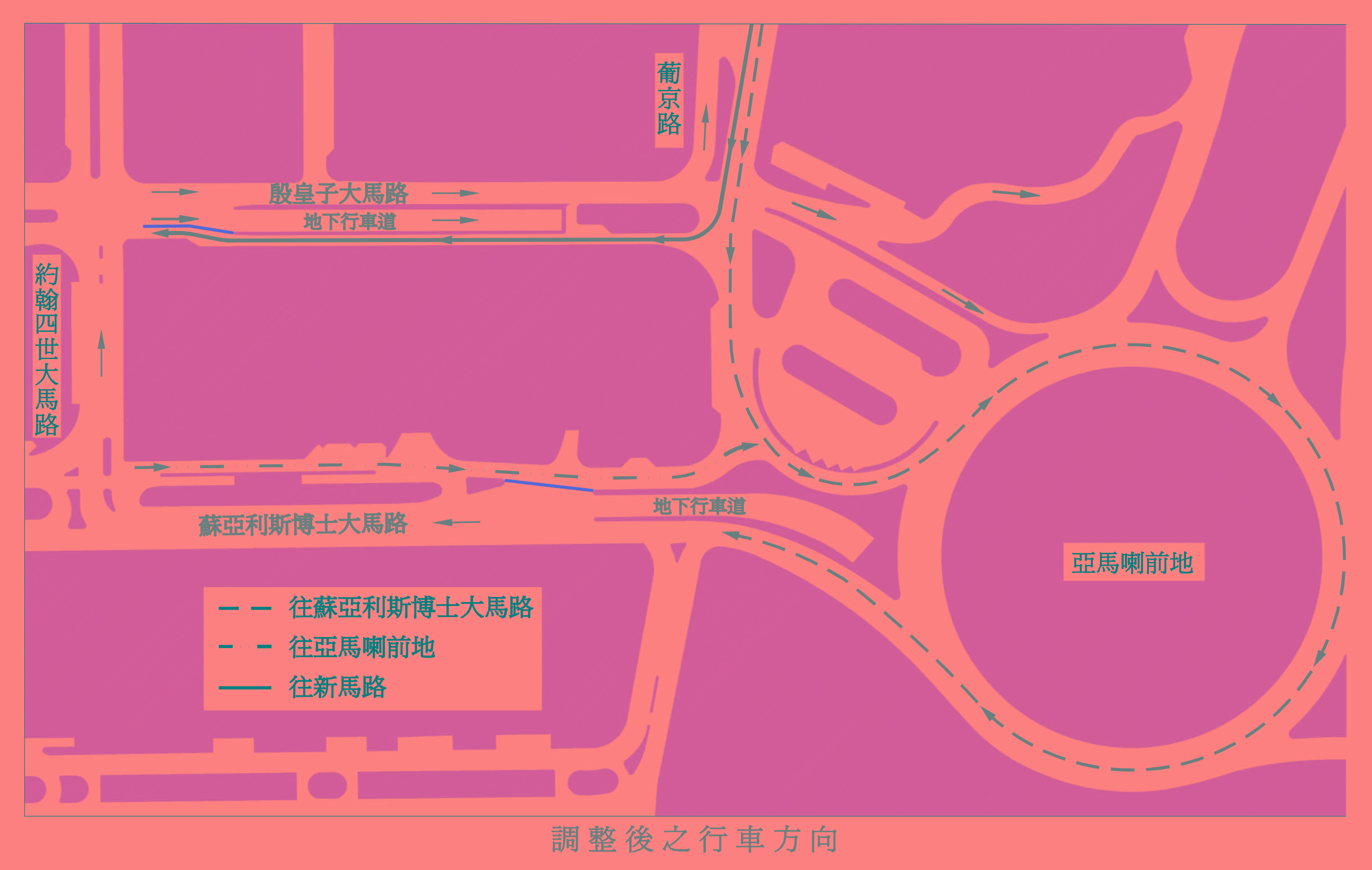 為優化亞馬喇前地周邊道路的交通運作,土地工務運輸局將於本周五(本月四日)早上十一時起調整靠近中國銀行大廈的一段殷皇子大馬路和蘇亞利斯博士大馬路的行車方向,調整後,將可使車輛的行駛路線更為直接,從而減輕友誼廣場以至南灣一帶的交通壓力。