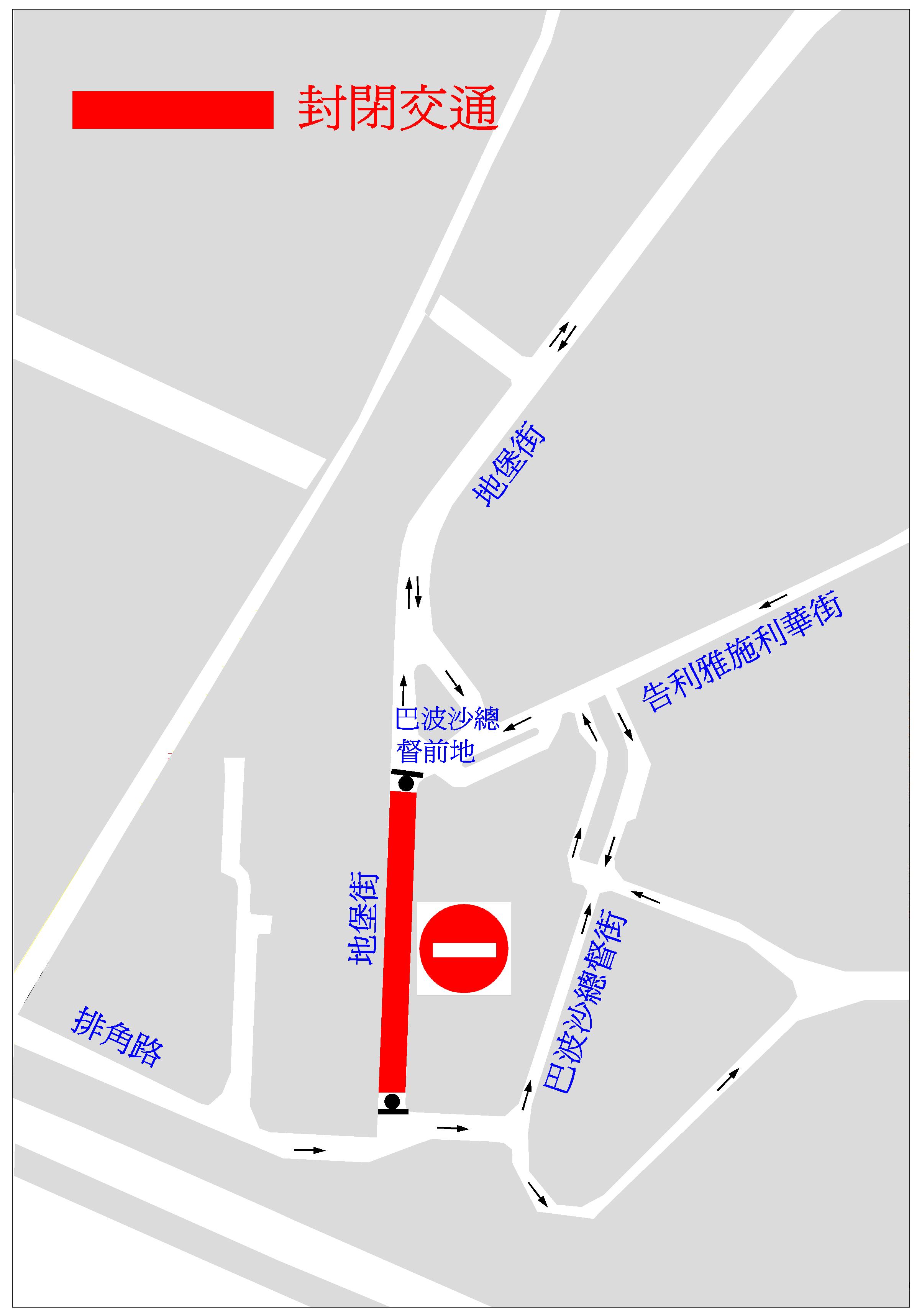 為配合土地工務運輸局於氹仔地堡街開展重鋪路面工程,由本周三(16日)上午十一時起,介乎巴波沙總督前地與排角路之間的一段氹仔地堡街將臨時封閉,禁止車輛通行及泊車;工程期間,來自告利雅施利華街往排角路的車輛可經地堡街、奧林匹克大馬路及體育路前往該路段。