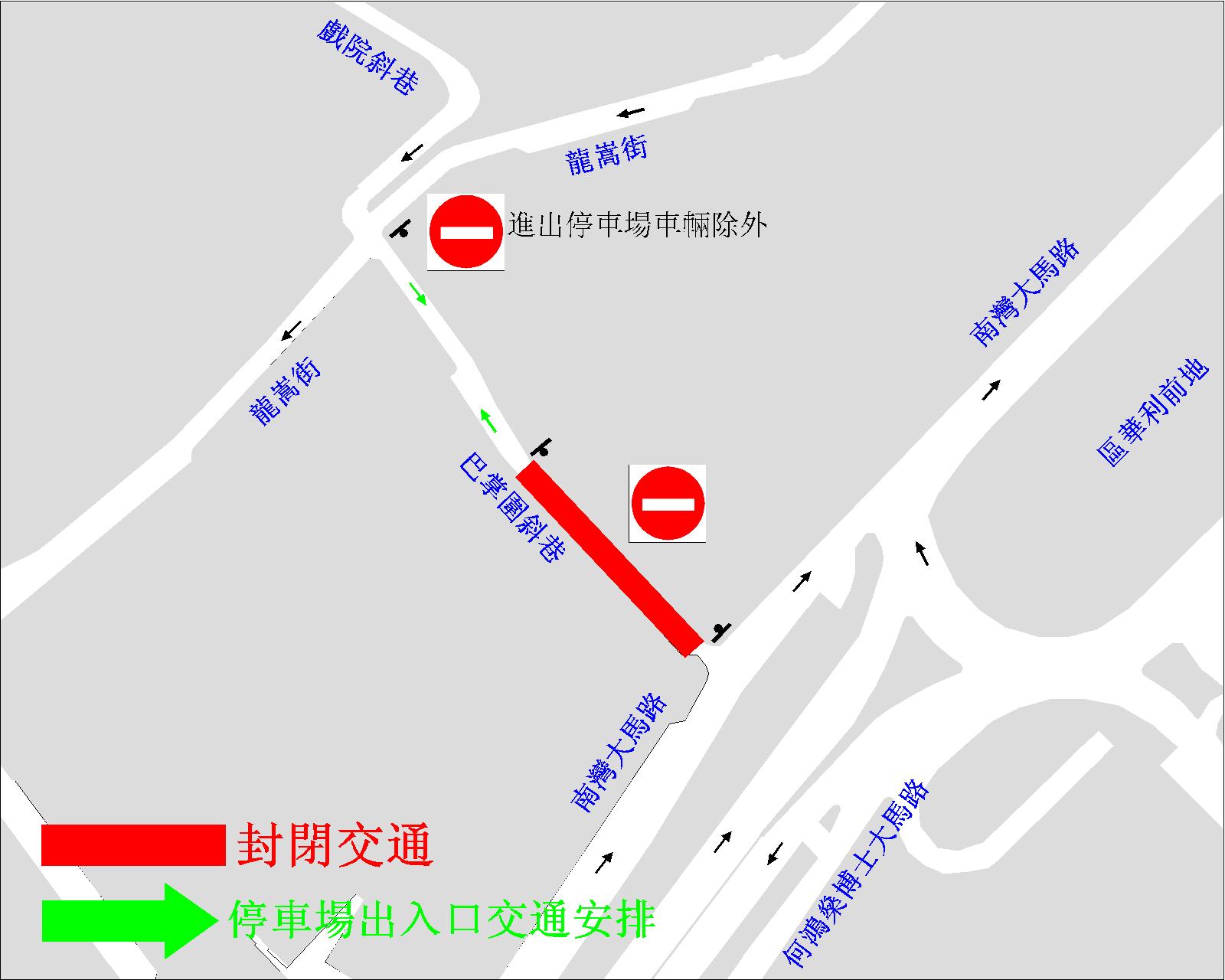 民政總署於本周四起在巴掌圍斜巷一段道路進行下水道接駁工程,為配合有關工程開展,當日上午十一時起,南灣大馬路近巴掌圍斜巷的路段將實施有限度通車;近金麗大廈路段的電單車泊車位將設置作臨時巴士站,供乘客上落車。介乎南灣大馬路與永利大廈之間的一段巴掌圍斜巷將封閉,路段上多個咪錶泊車位也會暫時停用。另外,介乎嘉華閣與龍嵩正街之間的一段巴掌圍斜巷,除進出停車場之車輛外,其他車輛一律禁止通行及泊車。上述交通改動為期20日,待工程完成後,將恢復原來的行車運作。
