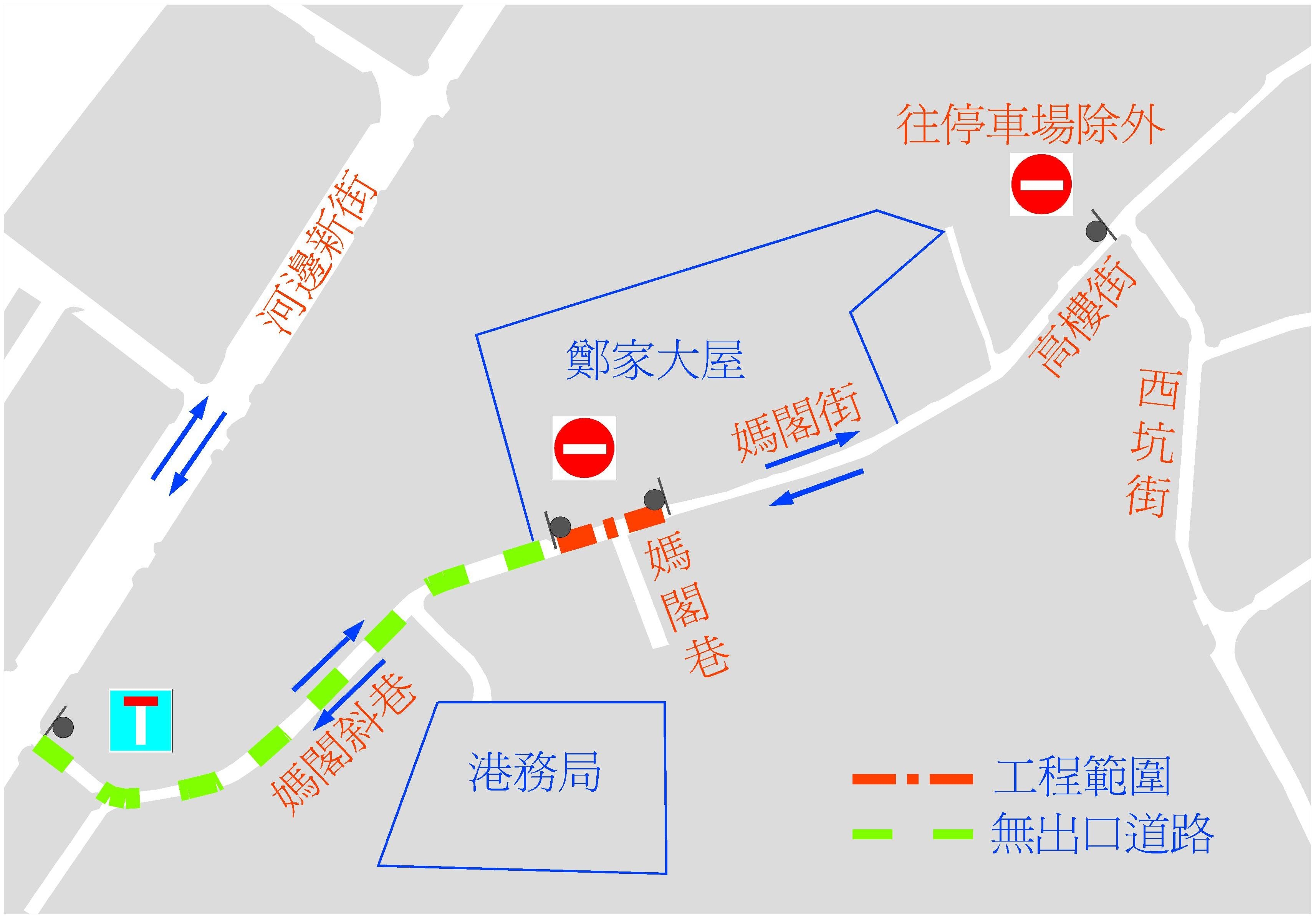 為將鄭家大屋內部的污水排至公共排水網,文化局需在多處道路進行接駁街渠工程。為配合有關工程進行,周二上午十一時起,介乎天台圍與金利樓之間的一段媽閣街,介乎西坑街與龍頭左巷之間的一段高樓街,以及介乎龍頭左巷與天台圍之間的一段媽閣街,將實施封閉交通。工程進行期間,除准許緊急服務及停車場的車輛進出,一律禁止車輛通行。而介乎媽閣巷與媽閣斜坡一段媽閣街及介乎媽閣斜坡與河邊新街之間的一段媽閣斜巷會成為無出口道路。同時,高樓街、西坑街和媽閣街部份咪錶泊車位,以及鹹角街電單車泊車區均禁止停泊車輛。