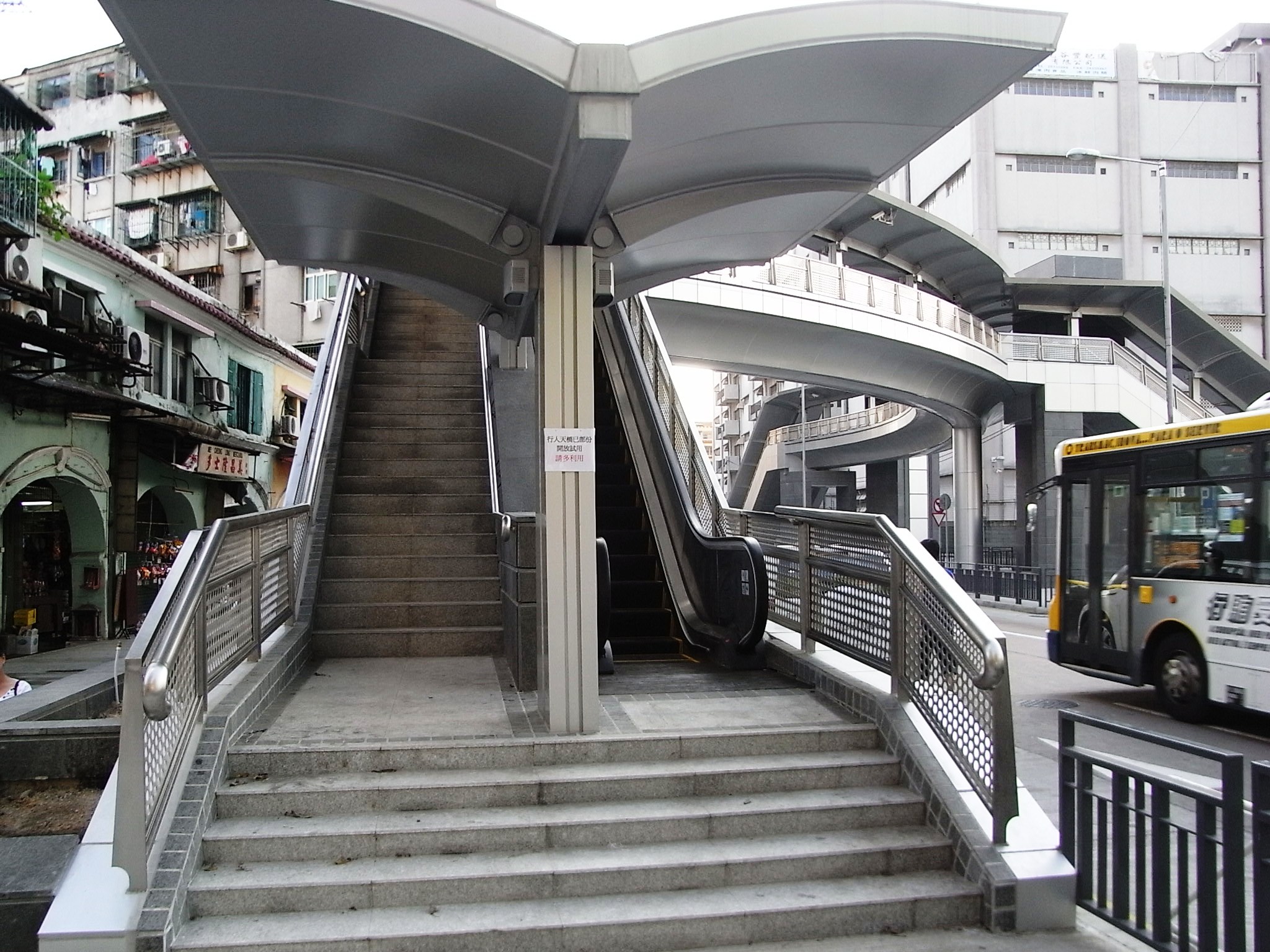 河邊新街行人天橋的建造工程已完成,並於今天(七日)先開放樓梯及扶手電梯予公眾試用,至於升降機待完成安全測試後,亦將隨即對外開放。土地工務運輸局相信,河邊新街行人天橋啟用後,能改善該區人車爭路情況,方便居民橫過馬路。