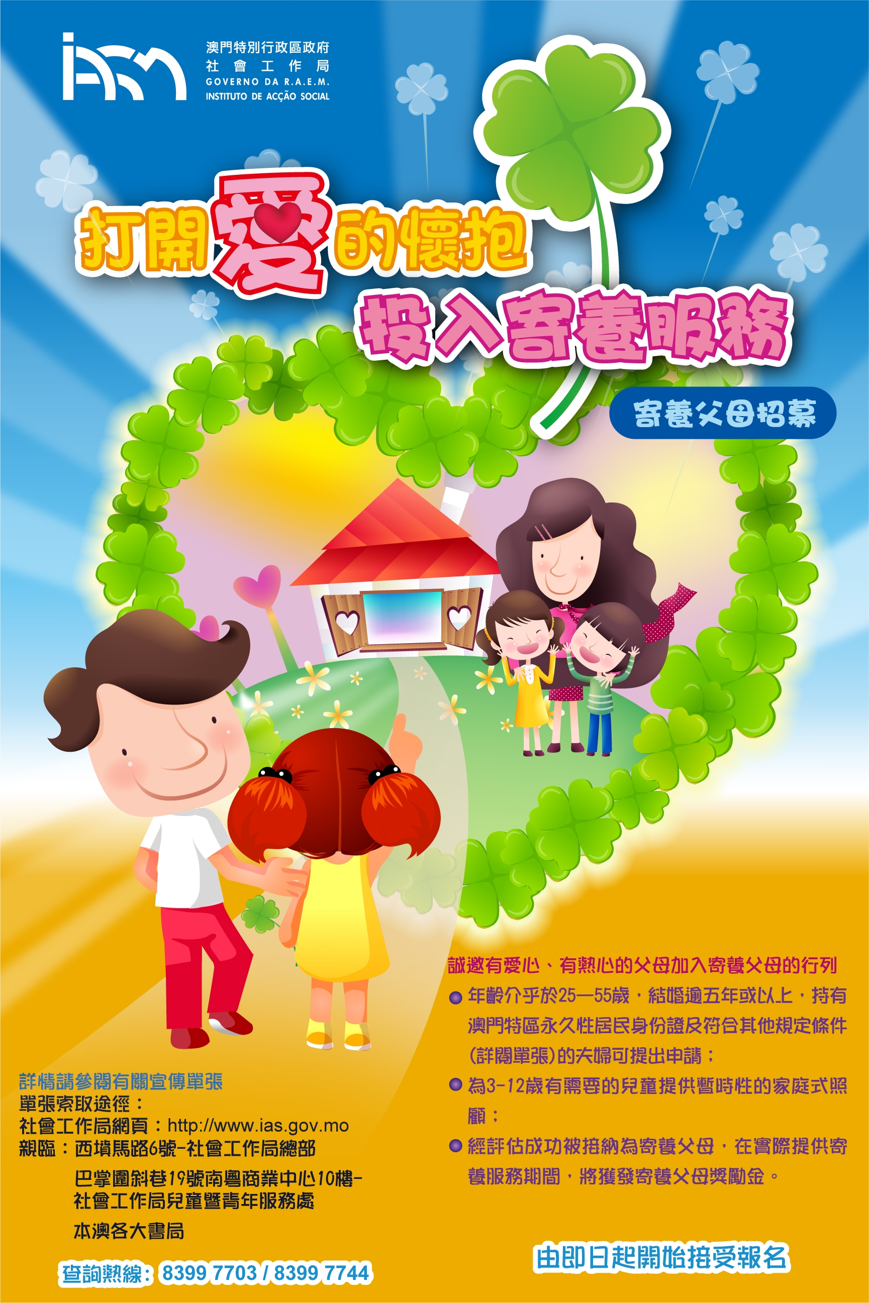 「打開愛的懷抱,投入寄養服務」,為了讓更多有需要的孩子得到適切的幫助,社會工作局現正招募寄養父母,歡迎有愛心又熱心的家長們,加入寄養家庭的行列。