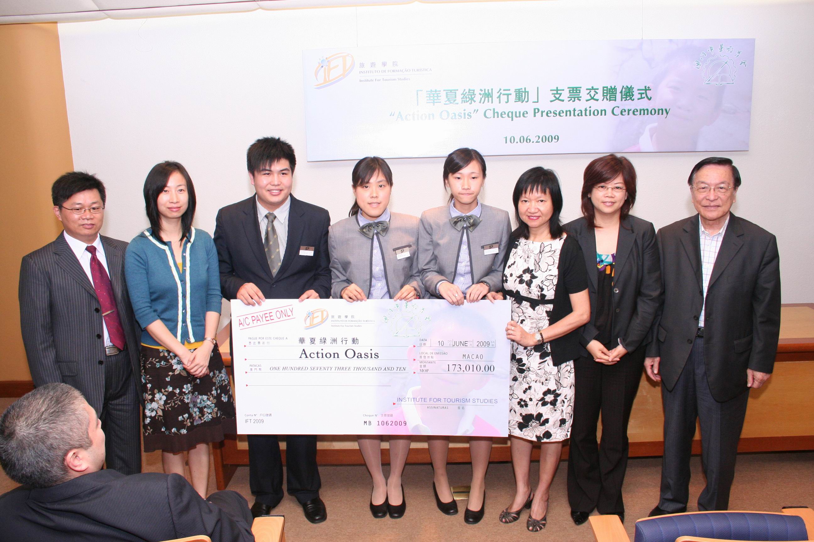 旅遊學院酒店管理專業2年級學生為澳門中華教育會「華夏綠洲行動」籌募善款,籌得共澳門幣173,010元,支票交贈儀式於是日於旅遊學院協力樓禮堂舉行,由旅遊學院黃竹君院長聯同學生們將善款交予澳門中華教育會何少金理事長。參與籌辦活動的同學表示,透過籌辦「澳門偶像」慈善晚宴這個具意義的籌款活動,不但可以將課堂學到的理論學以致用,更體會到團隊精神的重要性,是十分寶貴的經驗,同時亦感謝學院及各贊助商的支持。
