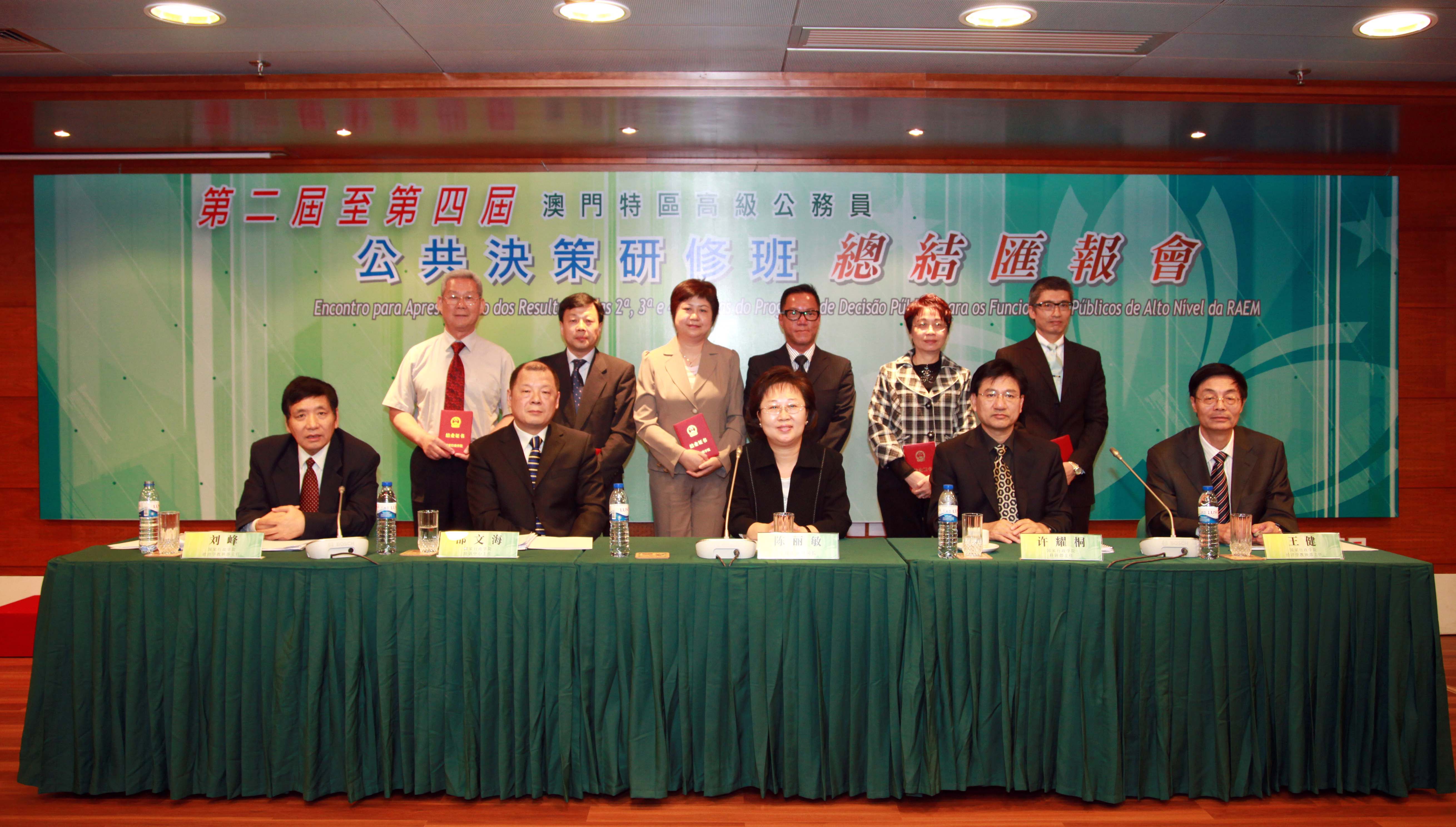 “澳門特區高級公務員公共決策研修班”是國家行政學院為澳門特區高級公務員而設計的重點培訓項目,對象為特區政府的領導級官員。學員的研究課題包括與社會民生相關的政策措施及《公共行政改革路線圖》的改革項目。該課程共分為兩個階段,第一階段是在北京國家行政學院進行5天的研討學習,第二階段在本澳就政府政策措施相關的課題進行為期約9個月的“行動學習”。