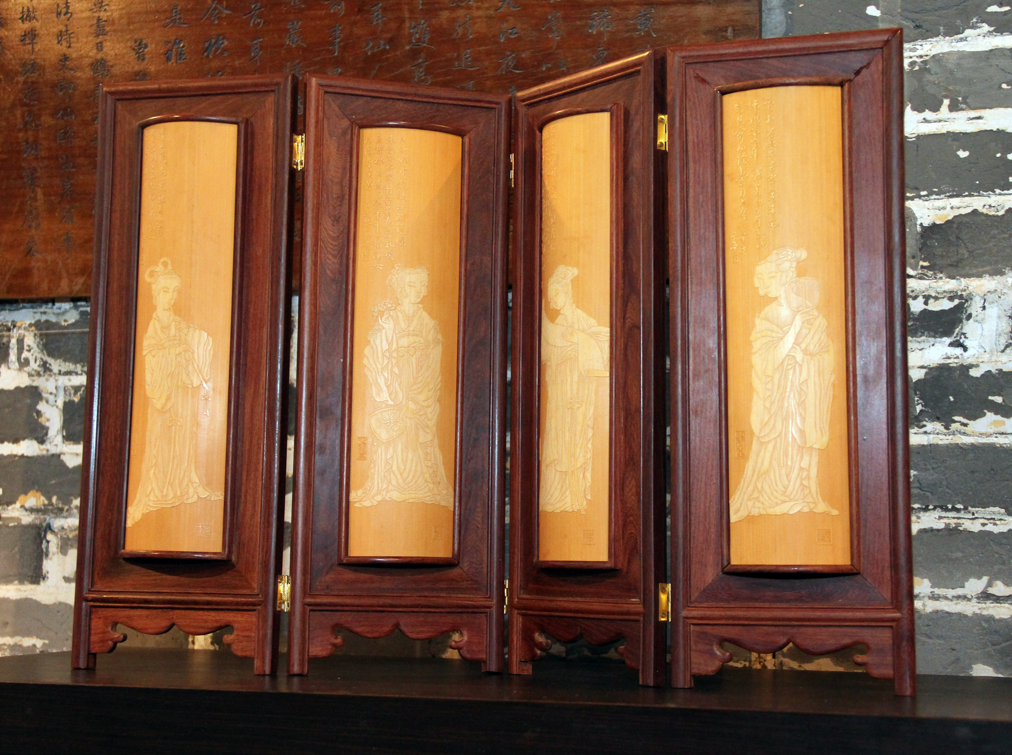 來澳工藝家邵風豐師從中國留青竹刻泰斗白士風,獲得多個全國、省工藝美術獎項,邵風豐用刀如筆,將山水、花鳥、樹石或人物等以深厚的刀法細膩呈現,現場展示的屏風、扇骨、臂擱等作品高雅淸新, 賞心悅目。