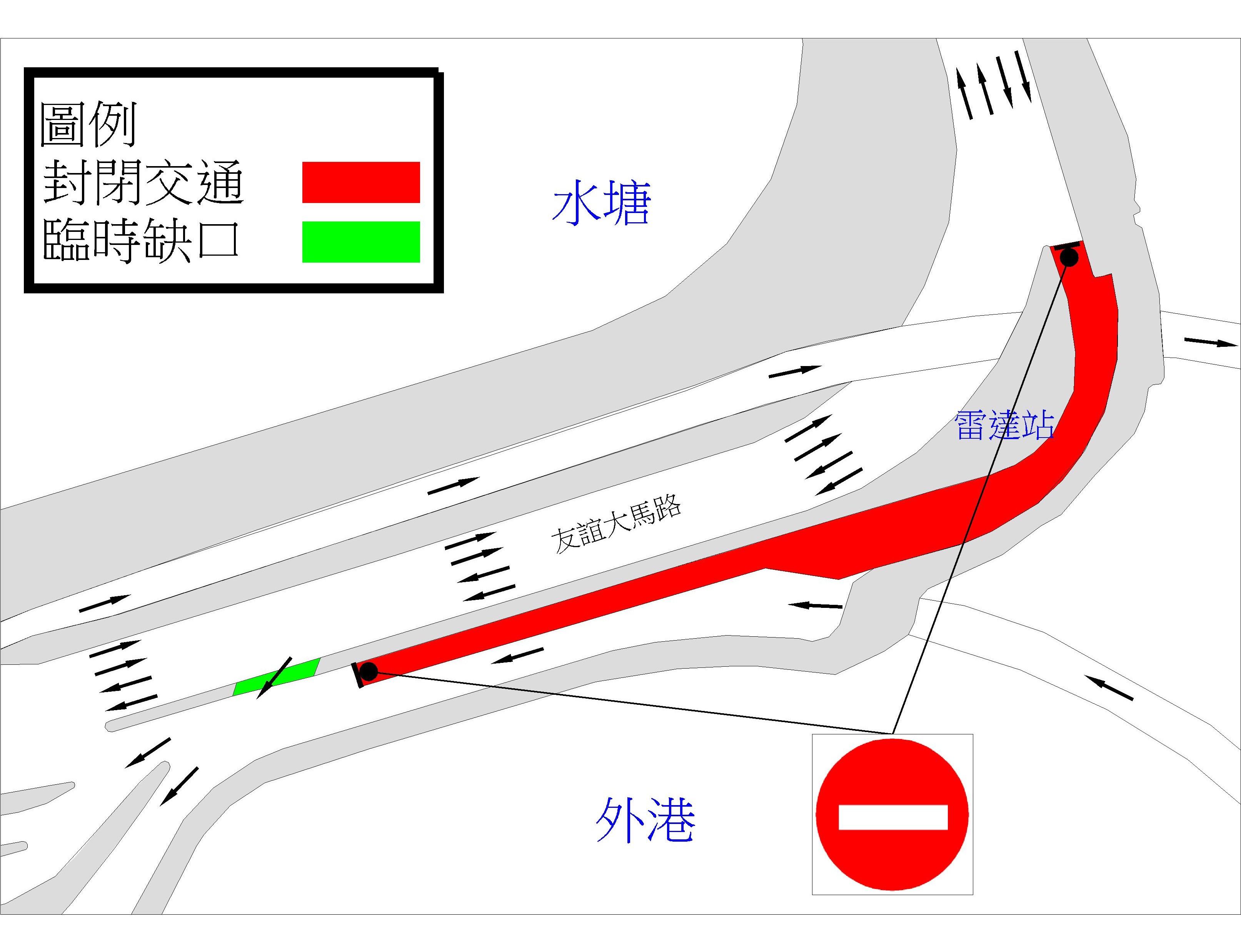 配合大賽車委員會進行重鋪賽車跑道的工程,從友誼大馬路往海港前地方向,近雷達站的一段內路,將於周五(23日)早上9時30分至周六(24日)晚上12時封閉。期間,交通事務局將於雷達站前方約50米位置臨時開通一個缺口,讓從友誼大馬路往海港前地方向的來車,可經該缺口前往港澳碼頭。