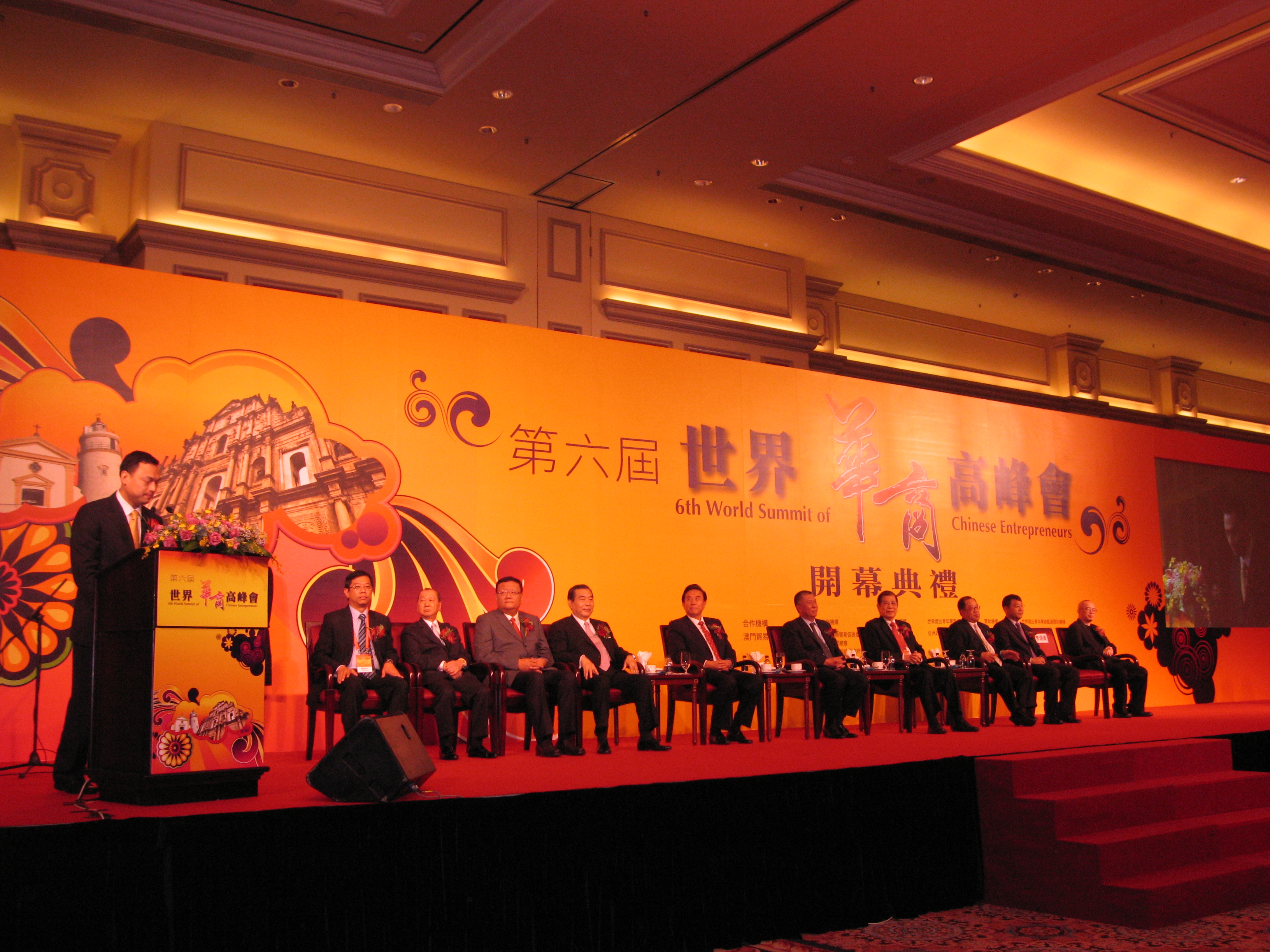 MIF一項重要會議論壇活動——“第六屆世界華商高峰會”今日上午隆重開幕,來自全球35個國家和地區的1300位華商社團代表參與,共聚一堂探討交流合作,挖掘全世界範圍內、特別是兩岸四地的潛在商機。第六屆世界華商高峰會”主辦機構為世界華商組織聯盟,合作機構是澳門貿易投資促進局。大會開幕禮由澳門特別行政區行政長官何厚鏵主禮,出席嘉賓有海峽兩岸關係協會會長陳雲林、台灣對外貿易協會董事長王志剛、中央人民政府駐澳門特別行政區聯絡辦公室副主任高燕、黑龍江省副省長孫堯、澳門特別行政區經濟財政司司長譚伯源及澳門貿易投資促進局主席李炳康等。