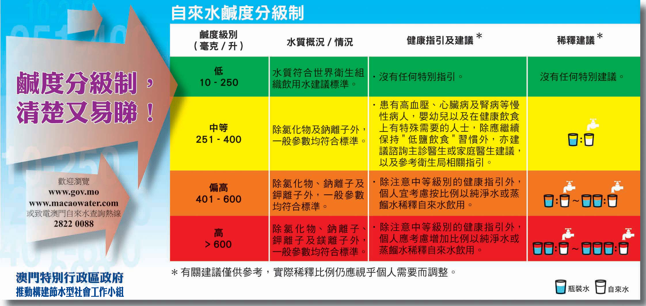 特區政府將透過社會工作局執行紓鹹補助措施,包括發放購買瓶裝水補貼,對象為受該局定期援助金的受益人,還有獲該局今年發放一次性三類弱勢家庭補助金的人士,每人每月將獲發放澳門幣一百元,以購買瓶裝水稀釋自來水飲用;另外,向受該局定期資助的134間社會服務設施,如托兒所、長者及傷殘人士院舍等發放補助金,每月補助金額由數百元至數千元不等;同時,當局會派發瓶裝水給接受“短期食物補助計劃”服務的市民;另外會組織本澳社團派發瓶裝水予行動不便的長者、疾殘人士及病患者等。瓶裝水由小組成員之一的澳門自來水提供。上述多項措施預計至少有3萬5千名市民受惠,每月資助總金額約為澳門幣一百八十五萬元。