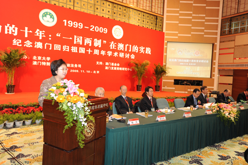 她表示,雖然“一國兩制”在澳門特區取得了初步的成功,然而實踐“一國兩制”是一項全新的事業,是一個探索的過程,依然需要中央政府的指導和全國人民的支持,需要澳門各界的共同努力,同樣也需要理論創新和學術界的深入研究。因此,今天的研討會意義重大,探討澳門10年來落實“一國兩制”、“澳人治澳”、“高度自治”方針的經驗和成果,研究《基本法》的理論和實踐,展望澳門特區的未來發展。