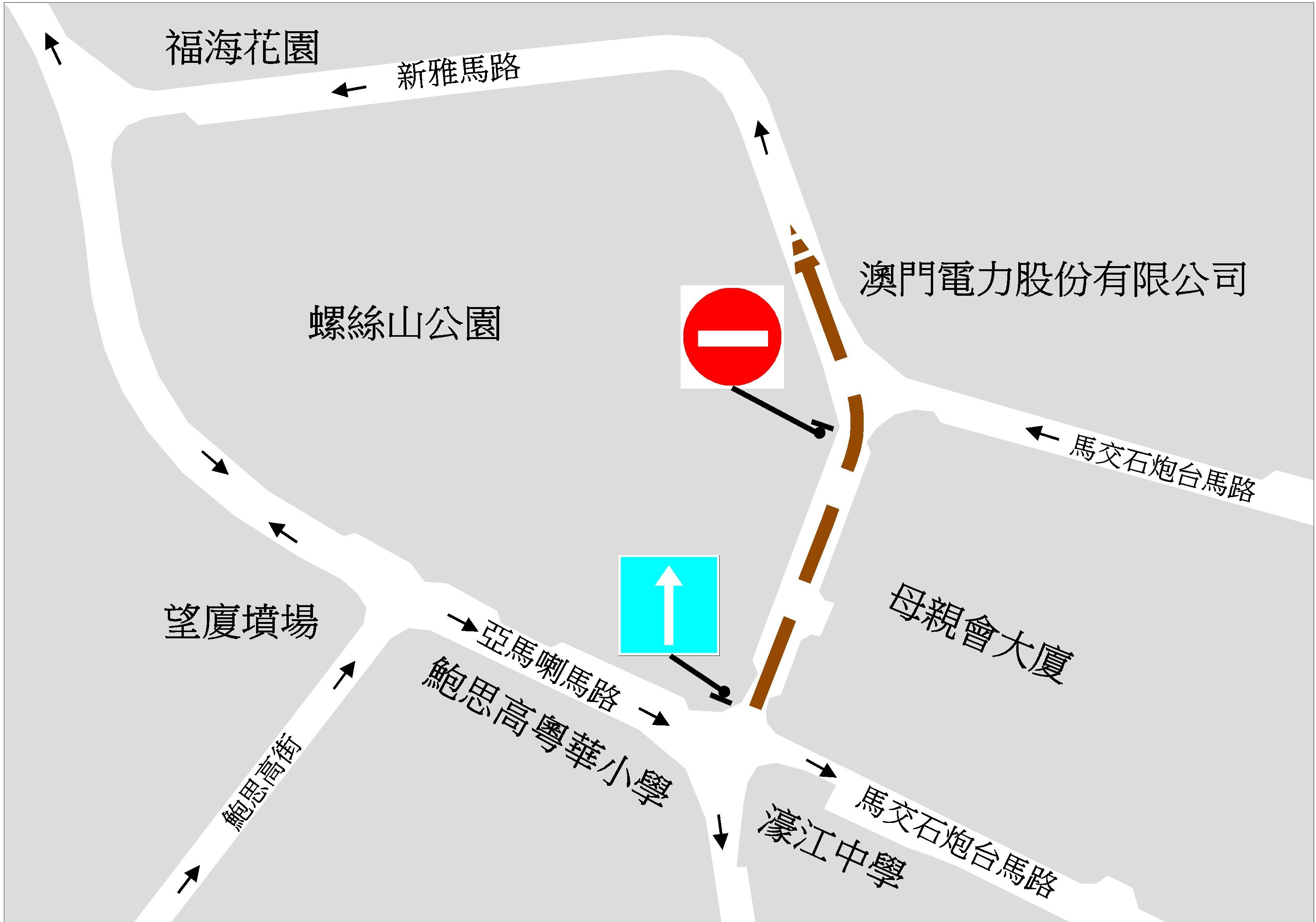 與此同時,介乎澳電大樓與母親會大廈之間的一段新雅馬路,亦將實施反方向行車,車輛可由亞馬喇馬路往福海花園方向行駛,屆時來自馬交石炮臺馬路近澳電大樓的車輛須繞行螺絲山公園後才能轉往亞馬喇馬路。
