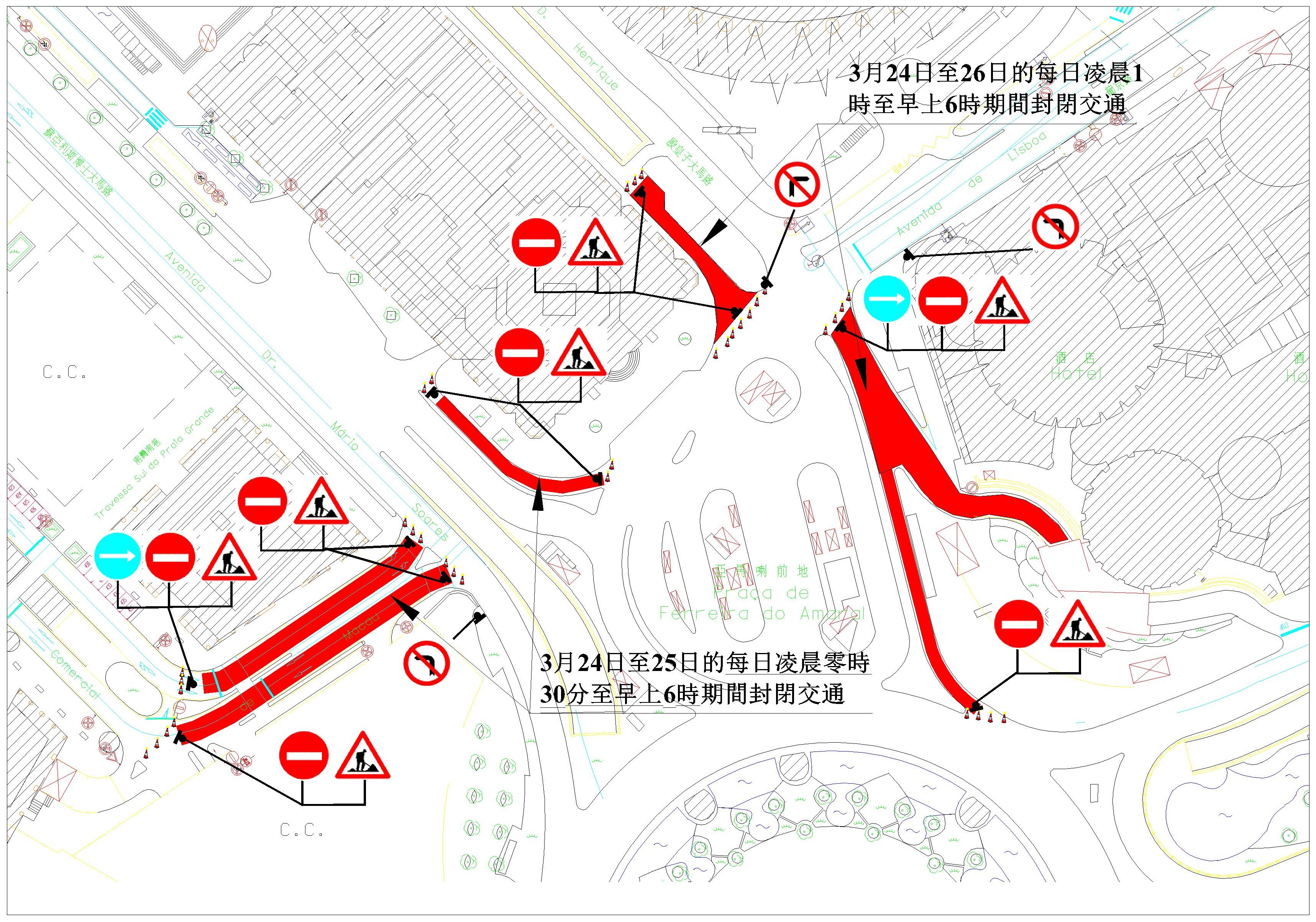 配合建設發展辦公室的重鋪路面工程,近亞馬喇前地一帶的多條道路將於周三(24日)至周五(26日)期間,分別實施交通管制措施,其中於周三至周四每日凌晨0時30分至早上6時,商業大馬路近蘇亞利斯博士大馬路的路段及蘇亞利斯博士大馬路近中國銀行大廈的路段將實施封閉交通及禁止泊車;而周三至周五每日凌晨1時至早上6時,殷皇子大馬路內路近中國銀行大廈的路段及亞馬喇前地內路近葡京酒店的路段,亦會實施封閉交通及禁止泊車措施。