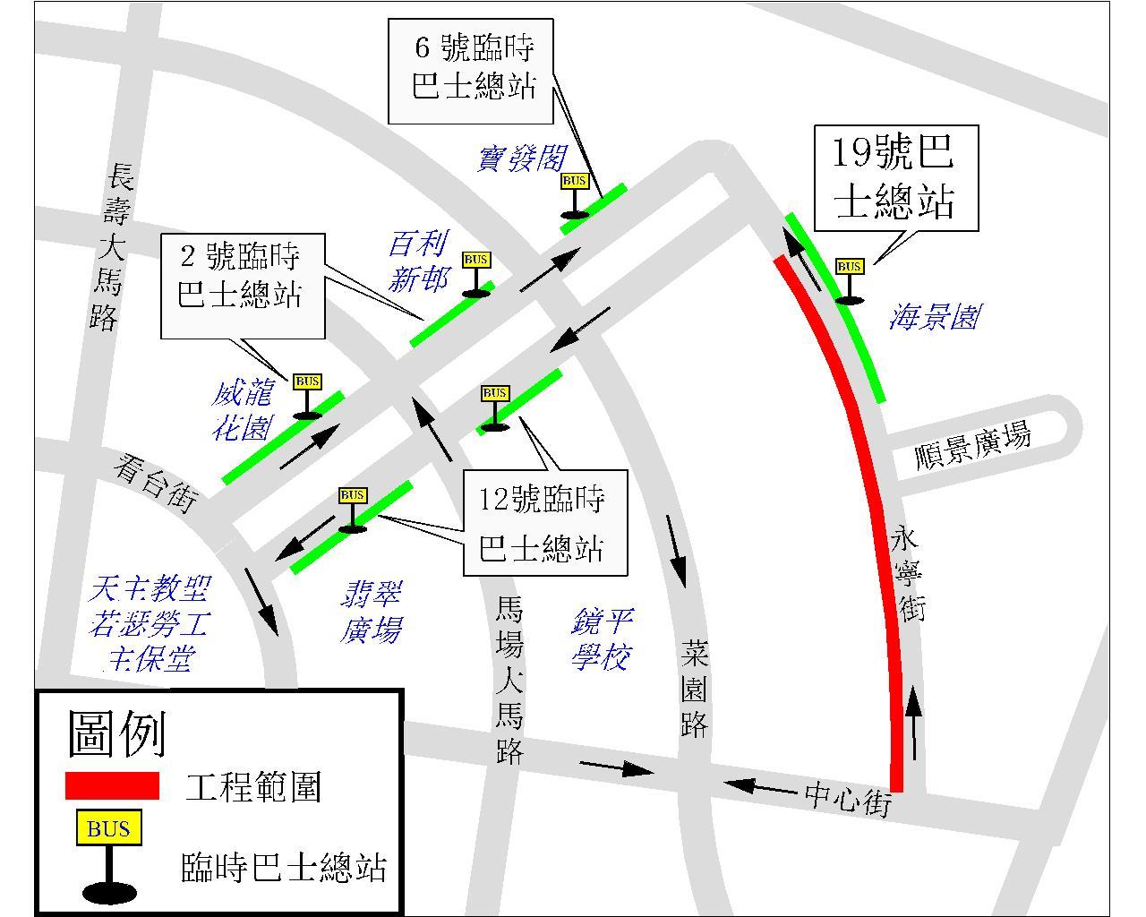 配合永寧街經濟房屋之興建,需要進行相關的下水道工程及水管、網絡鋪設工程,永寧街將於本月8日(周六)起實施有限度通車,工程地點禁止泊車,為期30日。受工程影響,除19號巴士路線維持停靠原巴士總站外,2號、6號及12號位於永寧街的巴士總站將臨時停用,2號巴士總站將臨時設於永寧廣場近威龍花園及百利新邨;6號巴士總站改設於永寧廣場近寶發閣;12號巴士總站則改設於永寧廣場近翡翠廣場及鏡平學校,相關位置的電單車及汽車泊車位將禁止車輛停泊。