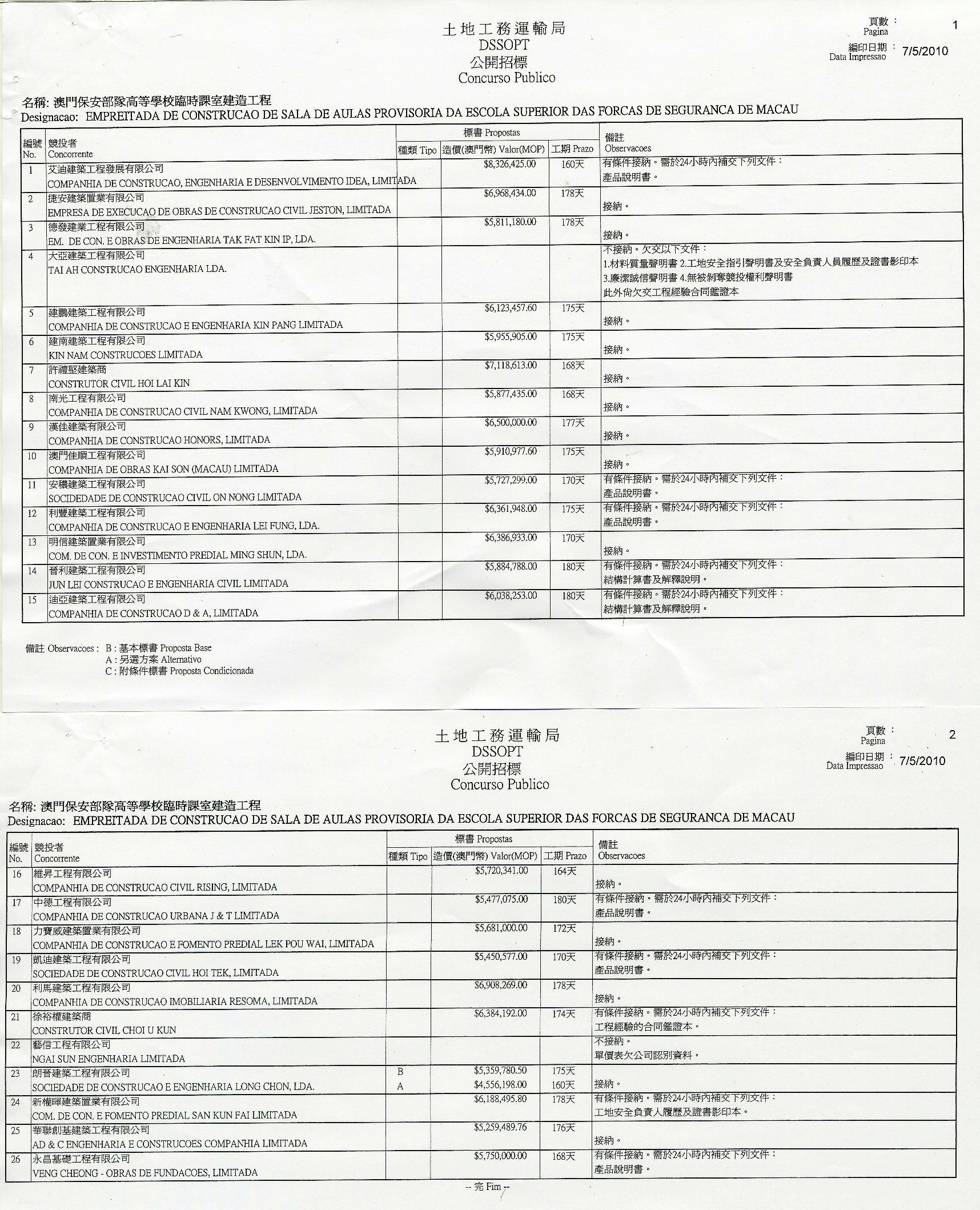 參與競投的公司中,14家公司被接納競投,10家公司因欠交產品說明書、工程經驗的合同鑑證本、結構計算書及解釋説明等文件衹被有條件接納,有關公司須於指定時間內補交文件,另2家公司不被接納,主要是單價表欠公司認別資料、欠材料質量聲明書及廉潔誠信聲明書等多份重要資料。