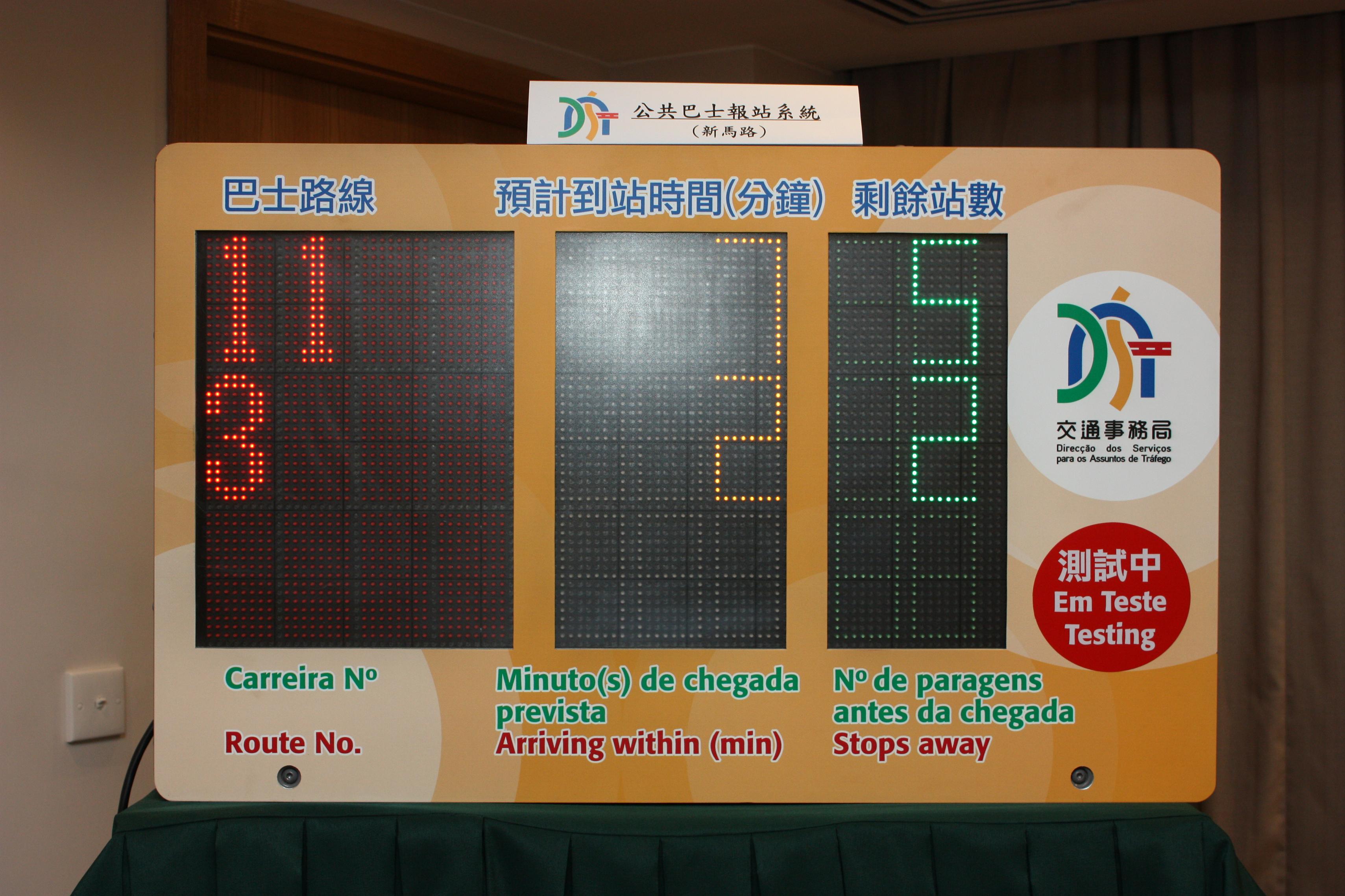 “公共巴士報站系統”顯示屏為單柱側掛式,顯示屏上印有繁體中文、葡文及英文描述,可顯示巴士路線、預計到站時間(分鐘)及剩餘站數合共三項資訊;同時,顯示屏為雙面設計,兩面均顯示同樣資訊,且具備光敏調節,使乘客無論在站內、站外,又或是夜間均能方便及保持視覺舒適情況下觀看到相關資訊。