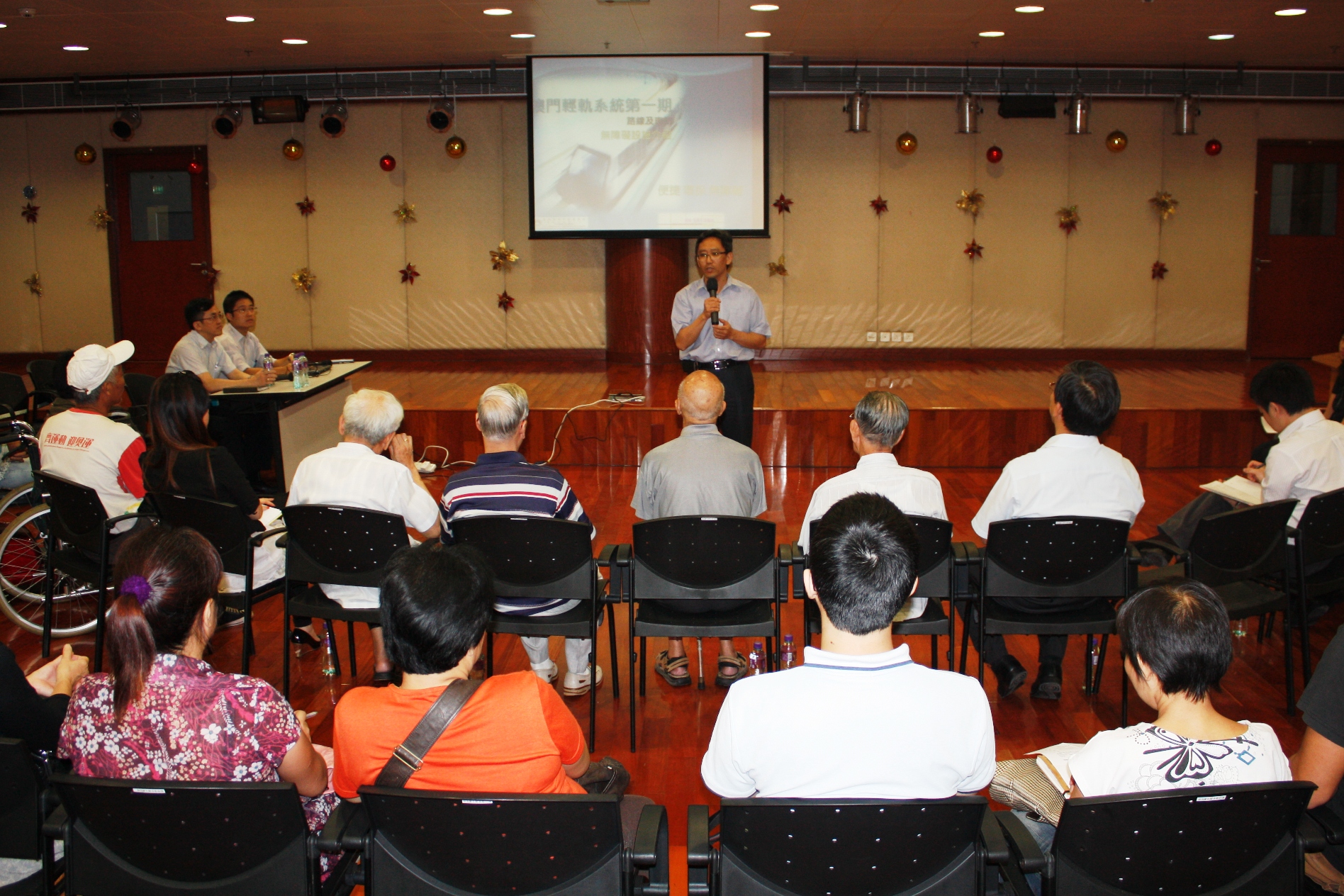 為了加深社會各界對澳門輕軌系統興建方案的認識,運輸基建辦公室持續展開宣傳和推廣工作。運建辦副主任何蔣祺、技術顧問林瑞海等一行六人,七月十九日下午到明愛明暉護養院介紹輕軌首期興建方案。活動邀請得到近四十名復康人士、長者、物理治療師、職業治療師等各類社會服務人員參與;澳門明愛總幹事潘志明也出席了座談會。