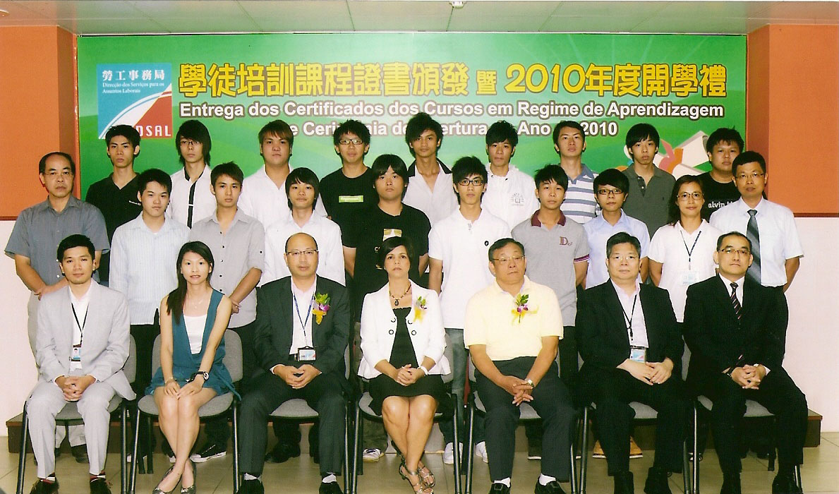 專為青少年而設的職前培訓-學徒培訓課程,日前在勞工事務局職業培訓廳-海洋辦事處舉行2010年度開學禮暨證書頒發儀式。出席典禮者包括勞工事務局林美美代局長、學徒培訓課程專業能力考試典試委員會委員張文寬先生、職業培訓廳孔令彪廳長、第十二屆至第十四屆學徒培訓課程學員等。