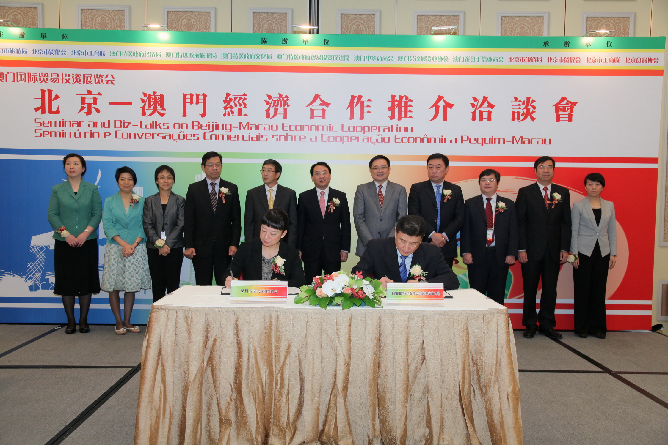 “北京-澳門經濟合作推介洽談會”亦於上午舉行,京澳雙方共同探討兩地經濟發展現狀和未來合作前景。北京市政府副秘書長劉志指出,希望加深兩地經貿合作多元化,建立兩地政府間合作的有效機制。澳門貿易投資促進局主席張祖榮表示,北京會展業及文創產業等經驗值得澳門借鑒,澳門將進一步發揮自身優勢,協助海內外企業開拓海外市場。會議推介了北京旅遊產業、食品產業及文創產業等,會上簽署了三份協議及備忘錄,其中,澳門貿促局與北京市貿促會簽署了雙方建立長期合作關係,包括宣傳、邀請雙方重要嘉賓出席相關展會等合作備忘錄。