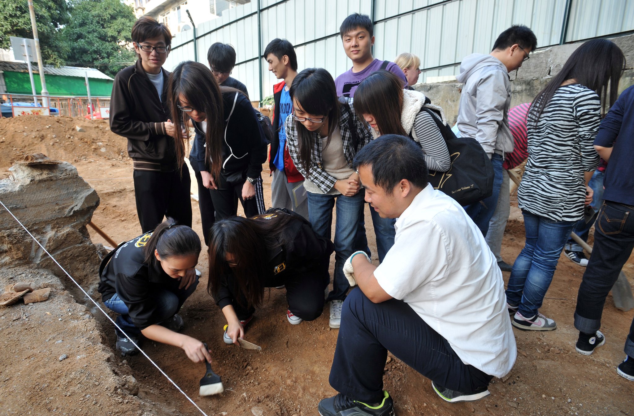 北京中國社會科學院考古研究所漢唐研究室專家朱岩石介紹時指出,聖保祿學院遺址目前挖掘到的大部分文物為明、清時代的磚瓦,初步判斷發現有部分較為完整的清朝瓷片。期間學生就多個有關考古工作的問題踴躍提問,專家逐一給予解答;學生又在專家的指導下手執工具,進行了初步的“撥泥”、“扒沙”、“刮土”、“掃瓦”等基本工作,有學生齊心合力挖掘出半隻破裂的碗底,認真嚴謹的態度和正確的挖掘手法,獲得專家稱讚。