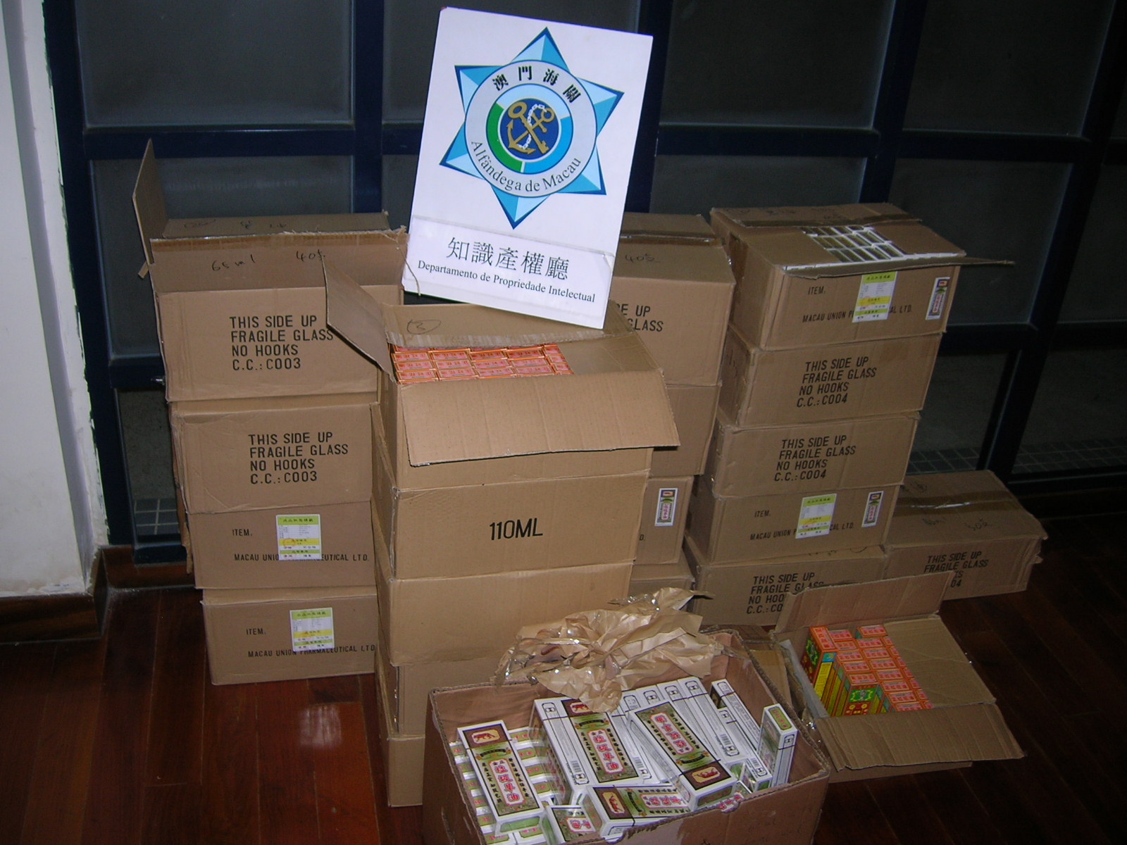 澳門海關接到權利人之舉報,指分別位於祐漢長壽大馬路,澳門關閘馬路及高士德大馬路「某」三間以集團式經營的藥房,涉嫌出售侵犯商標權之【霸力霉素】特效消炎解毒丸及【金老虎】藥油。海關收到舉報資料後,立即展開深入調查,並核實有關品牌【霸力霉素】已合法在澳門特區政府經濟局註冊登記。
