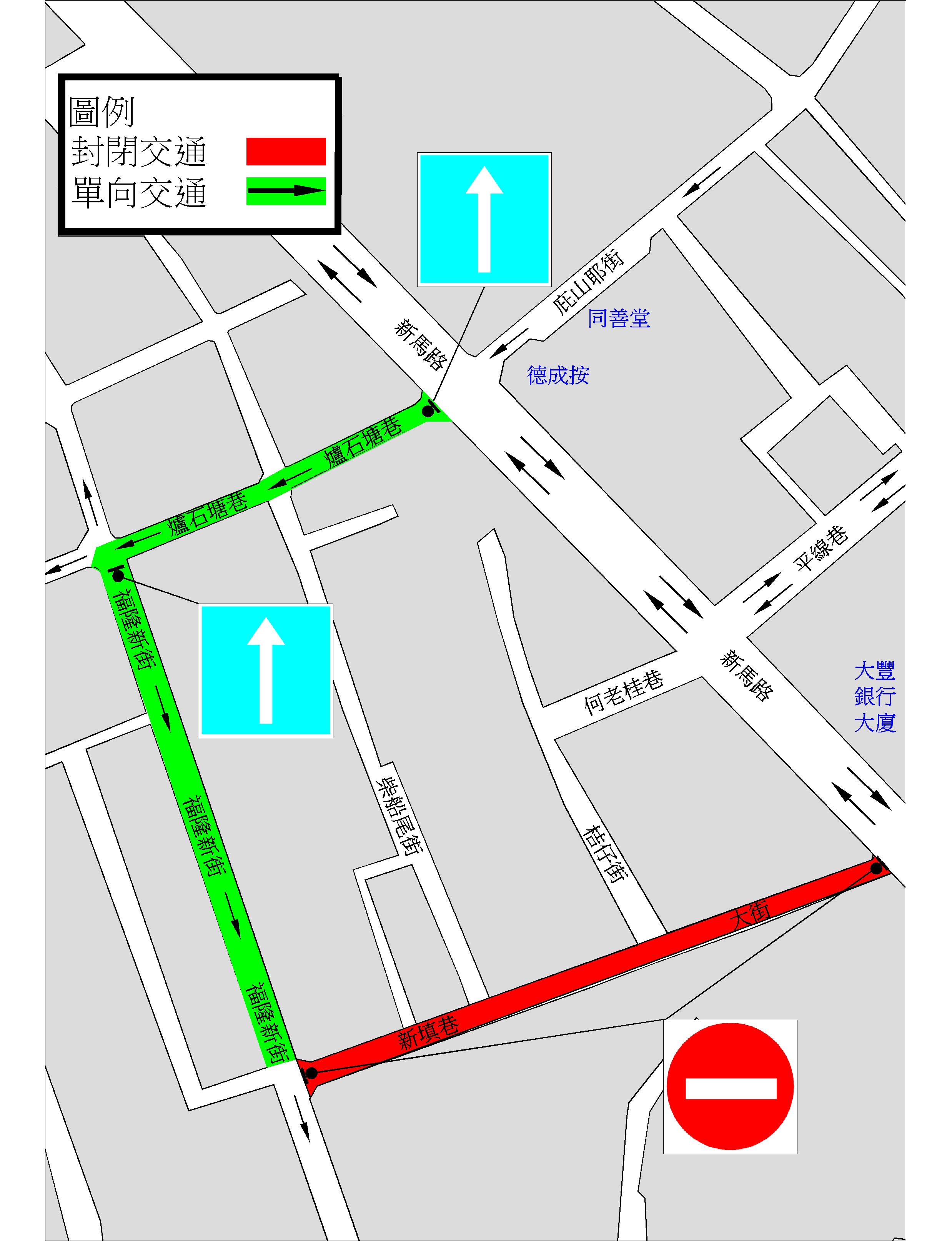 因接駁街渠,營地大街、新填巷、爐石塘巷及福隆新街於5月18日上午11時起至21日、5月23日上午11時起至28日實施臨時交通改道措施。其中大街及新填巷將封閉交通及禁止泊車;爐石塘巷及介乎爐石塘巷與新填巷之間的一段福隆新街將臨時改作反方向行車及禁止泊車,即車輛需要由新馬路經爐石塘巷前往福隆新街。