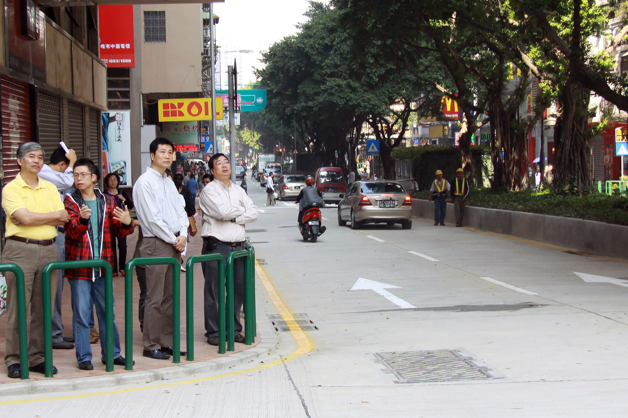 交通事務局代局長鄭岳威、土地工務運輸局副局長劉振滄、交通事務局交通規劃及建設廳廳長鄺偉卓等今日到高士德大馬路,視察臨時開放通車首日的交通情況,而整項高士德大馬路下水道重整工程將於今年底全面竣工。