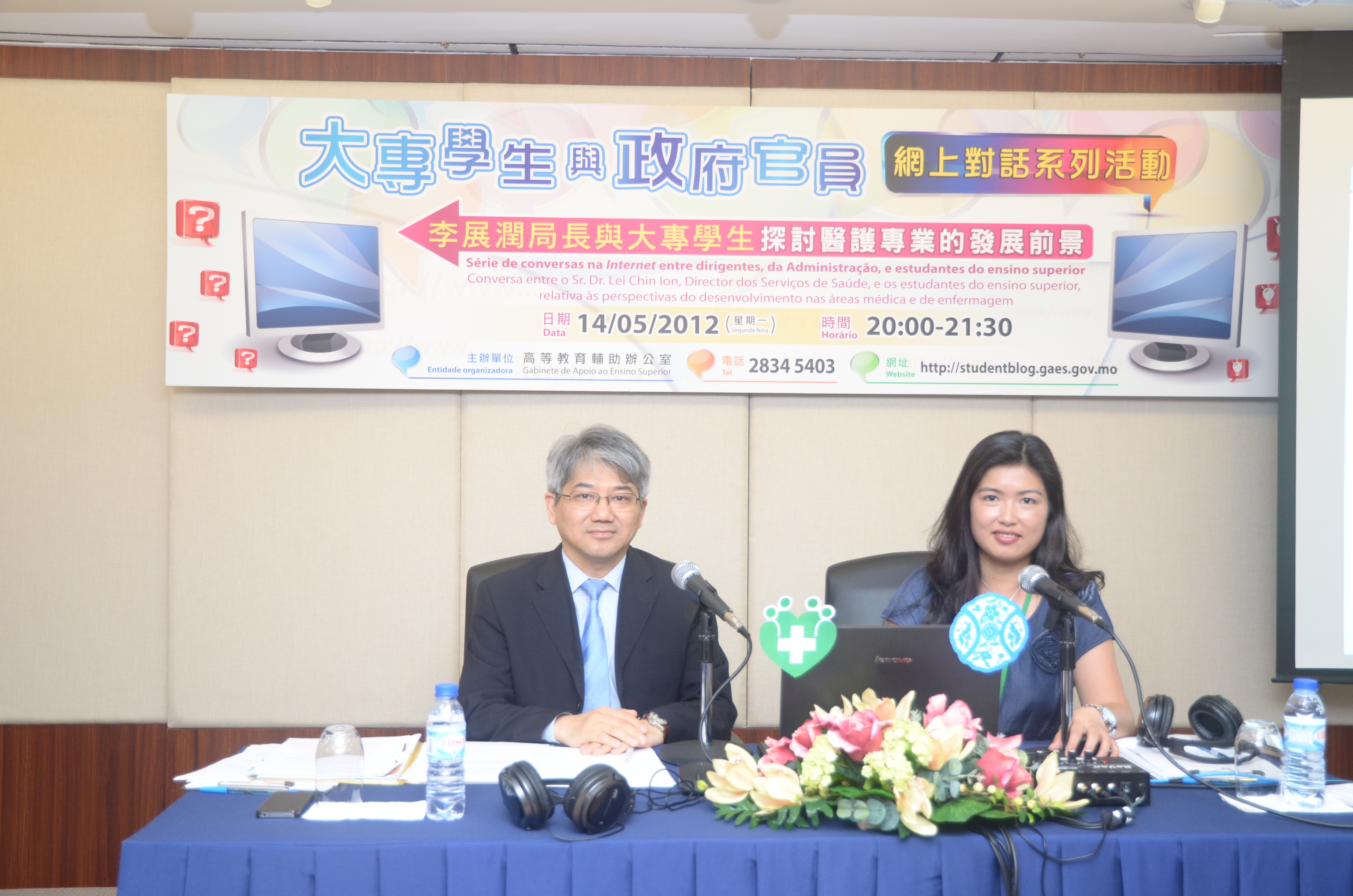 是次網上對話主題為“李展潤局長與大專學生探討醫護專業的發展前景”,吸引了於兩岸四地,甚至海外地區修讀醫護專業的學生透過澳門大專學生部落聊天室,即時與李局長互動對話。不少學生把握機會,踴躍提問,關注的問題包括學歷認證、醫護專業考核制度、醫務委員會設立、醫護人才需求、中醫藥等。在歷時一個半小時內,李局長耐心解答學生的提問,讓學生更清晰了解澳門醫護現況以及未來發展前景。