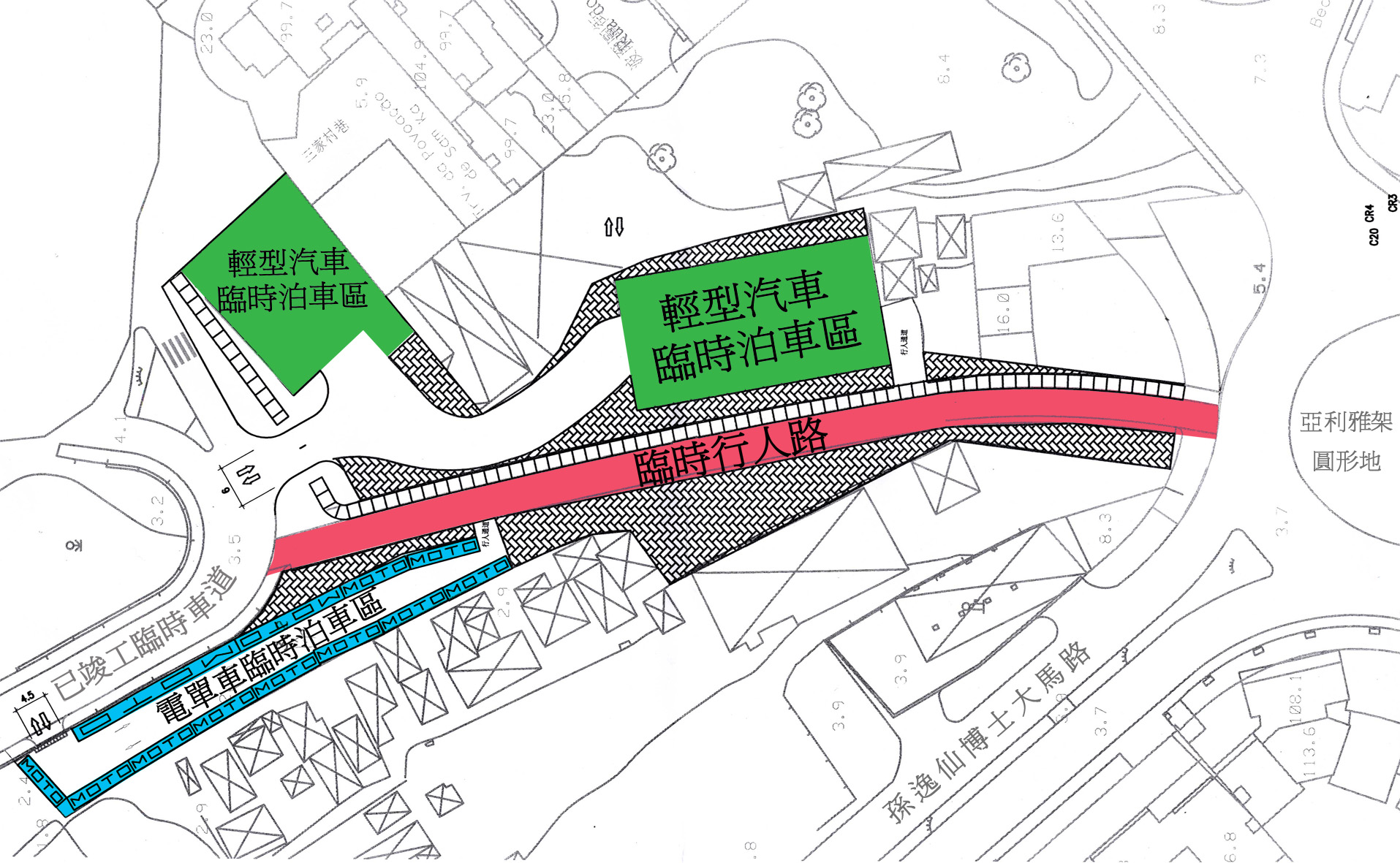 在該幅被收回的佔地上所興建的臨時行人路,全長約140米,連接已竣工的TN27臨時車道與亞利雅架圓形地,行人路一側將設有雨蓬方便居民出入;因應居民的泊車需要,在靠近公屋項目位置將配合交通需要增設臨時泊車區,駕駛者可經已竣工的新建車道進出臨時泊車區;此外,工程還包括建造雨水排水系統、平整地段和鋪設混凝土行人路面,因此,工程完成後可改善區內蚊患和紓緩長期水浸等問題。相關建造工程將緊接清遷行動後展開,預計年底前竣工。