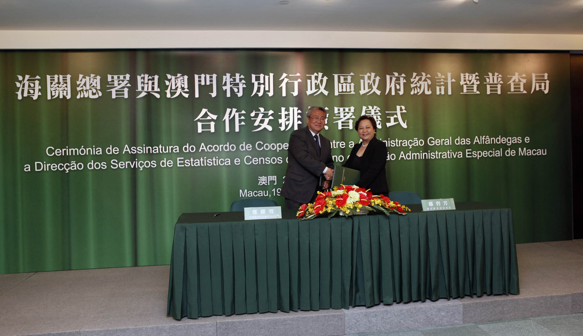 海關總署與統計暨普查局今天(10月19日)假中土大廈澳門商務促進中心簽署《海關總署與澳門特別行政區政府統計暨普查局合作安排》(下稱《合作安排》),建立對外商品貿易統計的合作機制,促進彼此合作與發展。