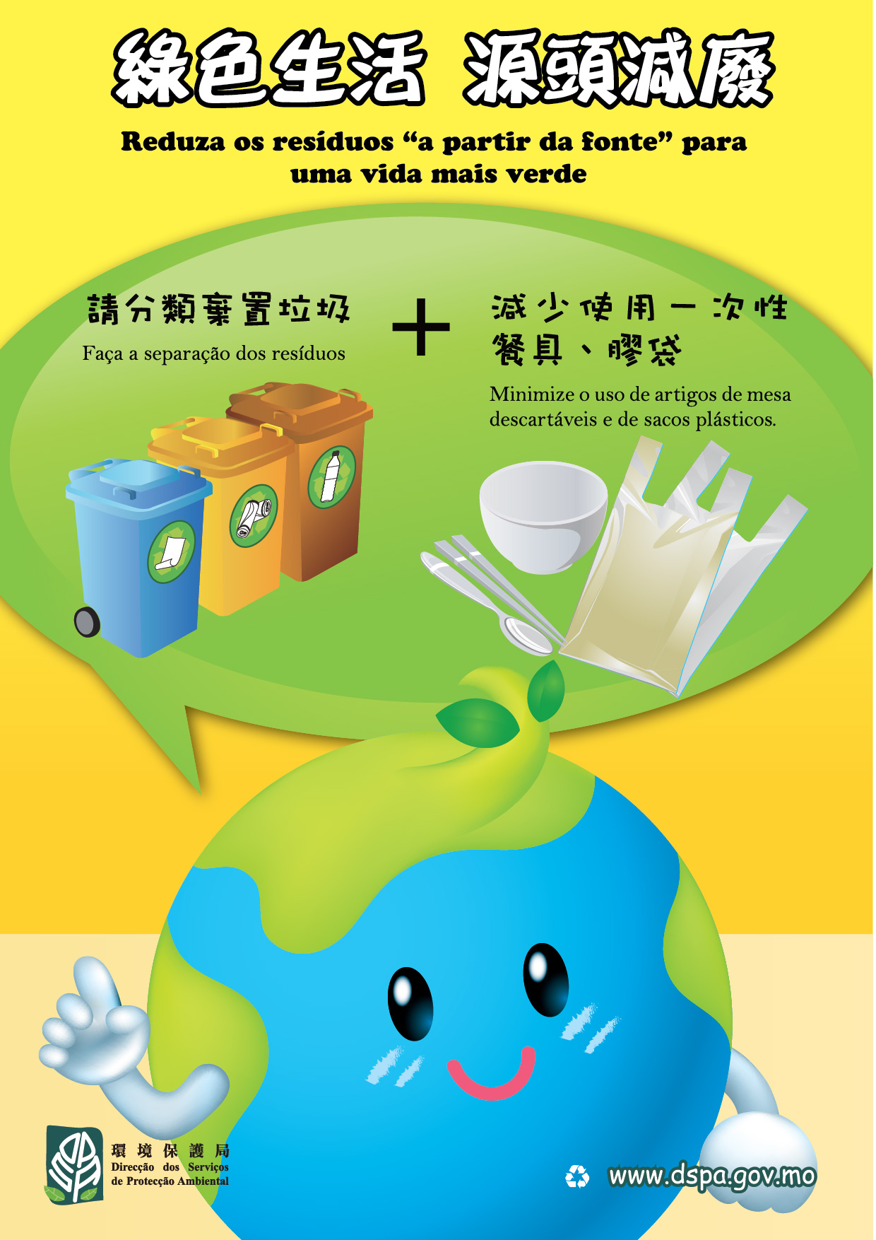 環境保護局為持續推動源頭減廢,提升市民環保意識,今年連續第三年與澳門餐飲業聯合商會合作推動「美食節減廢計劃」,於美食節現場設置攤位,以「地球先生及綠樹太太與您暢遊美食節」為主題,宣揚減廢訊息,提倡減少使用一次性餐具及膠袋,避免浪費食物等,並組織「綠色學校」學生及「環保Fun」義工,與「地球先生」及「綠樹太太」暢遊美食節。