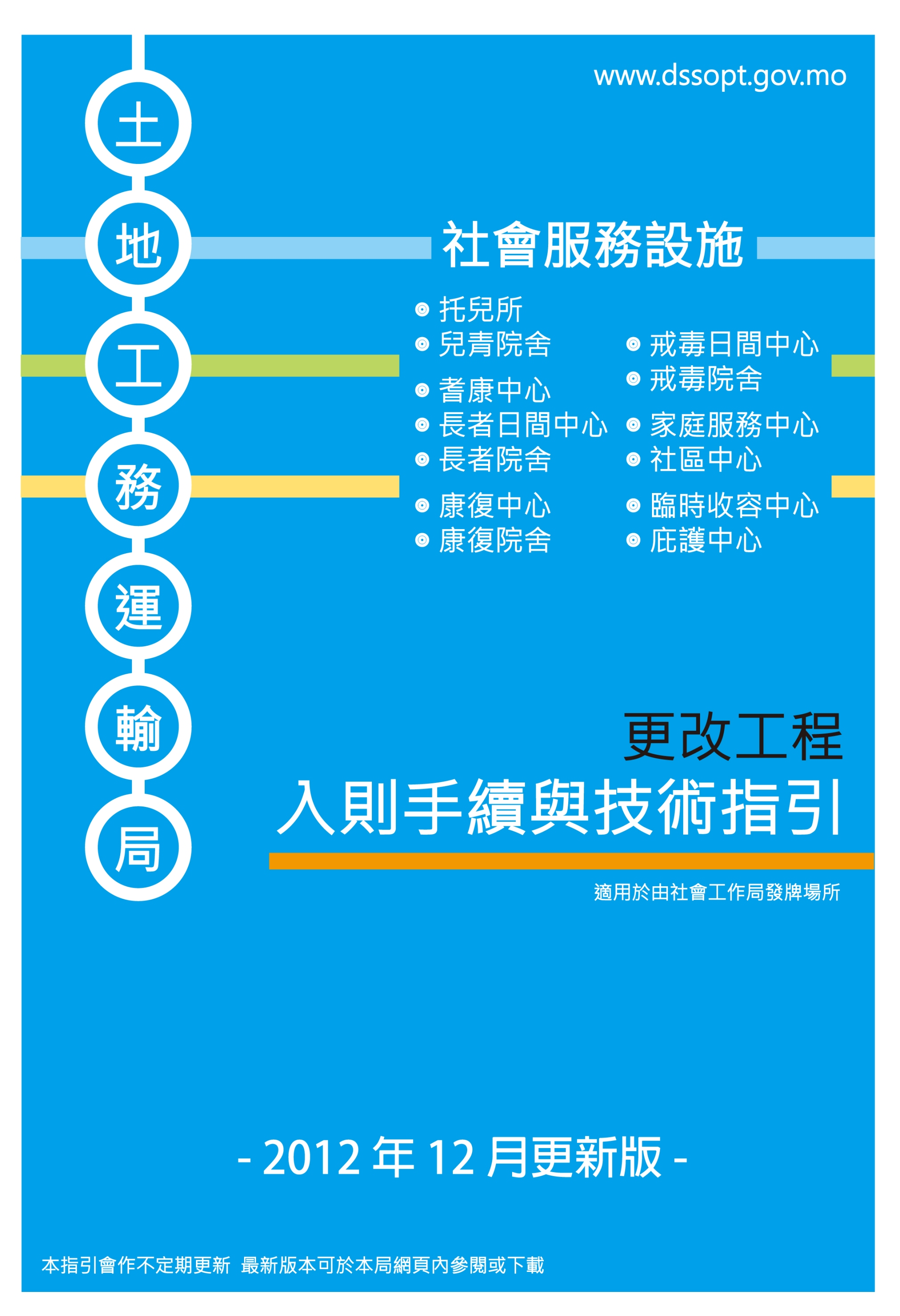 土地工務運輸局針對較常涉及行政准照的更改工程,陸續制訂有關入則手續與技術指引,並按社會發展和相關權限部門意見適時更新,以落實政務公開及讓指引內容更切合當下社會實際需要。因應社會工作局意見,局方最近更新於去年推出的《托兒所、老人院舍及社區活動中心更改工程入則手續與技術指引》內容,將指引適用範圍擴展至覆蓋所有由社會工作局發牌的社會服務設施,新指引明(12月6日)起可於土地工務運輸局網頁(www.dssopt.gov.mo)內參閱或下載。