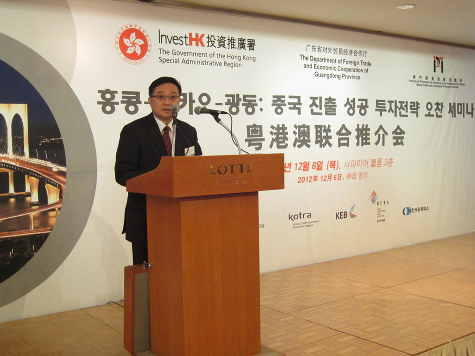 由廣東省對外貿易經濟合作廳、香港投資推廣署,澳門貿易投資促進局聯合主辦 “2012粵港澳聯合推介會” 於2012年12月6日,在韓國首爾樂天酒店舉行。