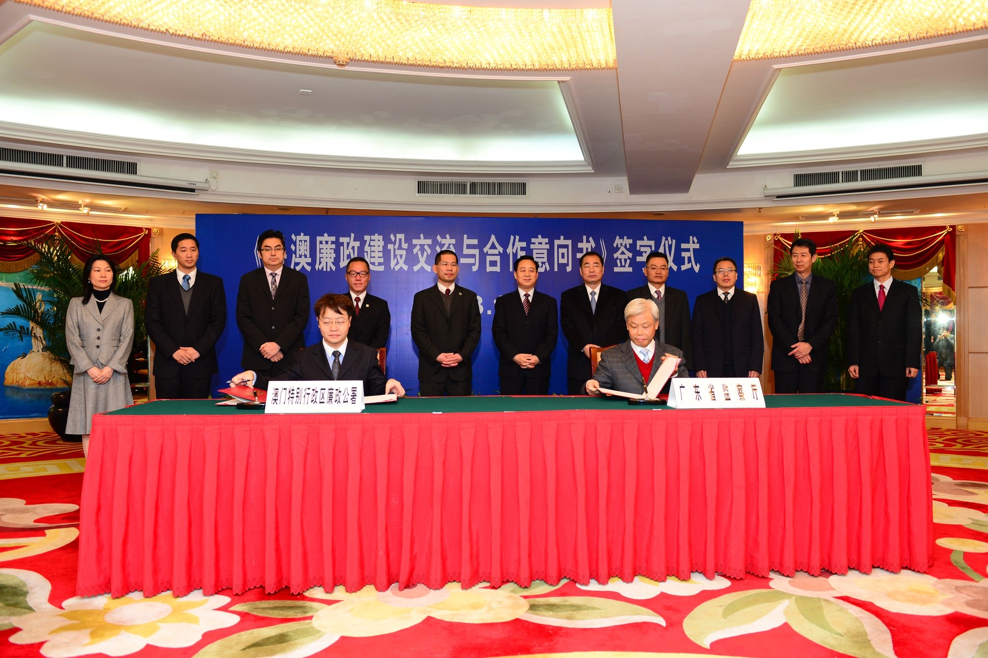 簽署儀式於今日下午5時在珠海舉行,在廉政專員馮文莊和廣東省委常委、省紀委書記黃先耀等見證下,廣東省監察廳廳長兼省預防腐敗局局長林浩坤與澳門廉政公署助理專員兼反貪局局長關冠雄,分別代表粵澳雙方簽署了《粵澳廉政建設交流與合作意向書》。