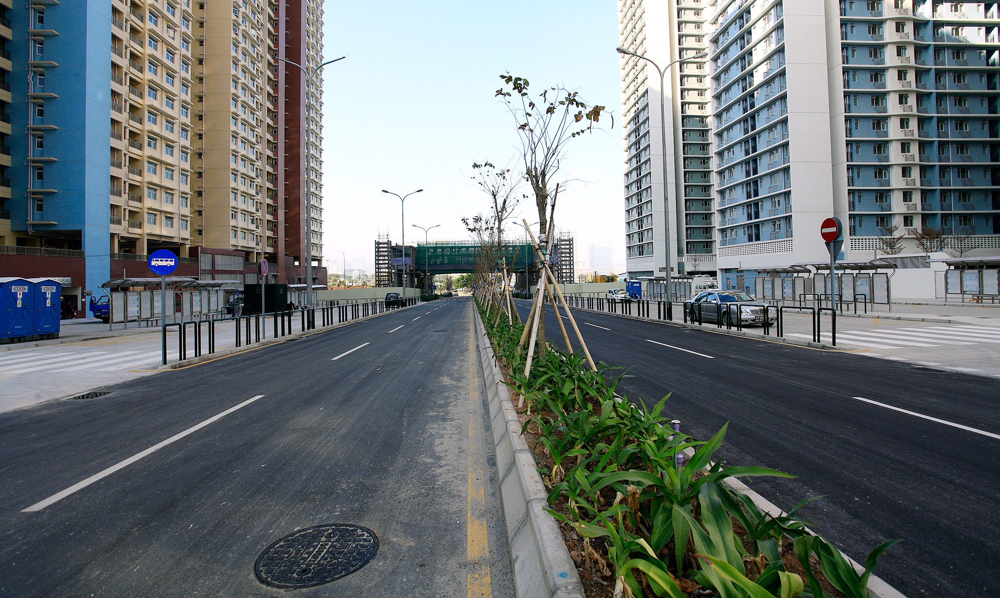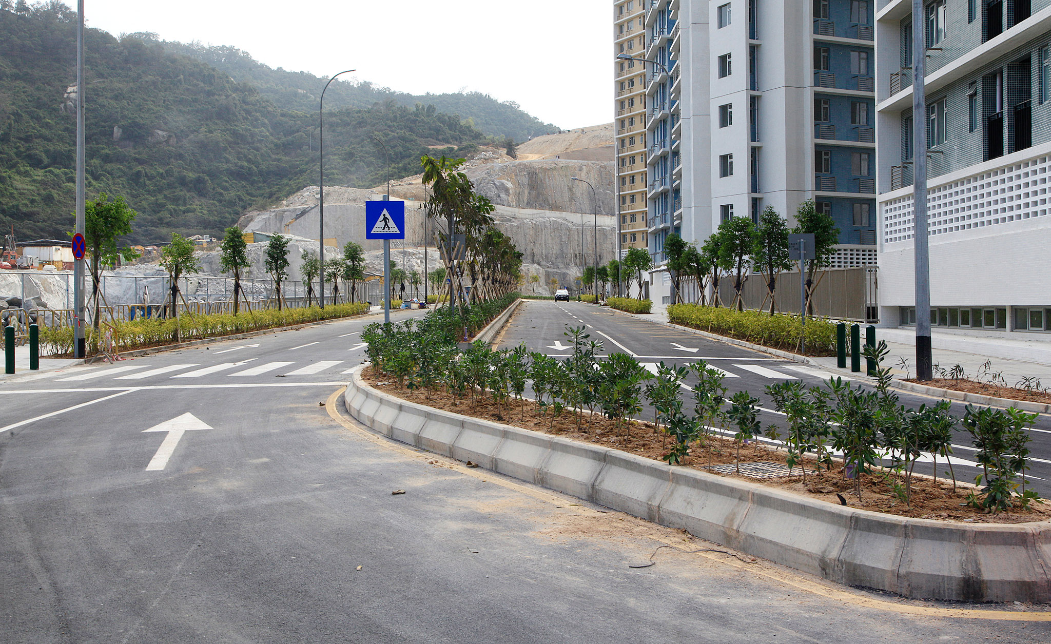 地面工程則包括路面鋪設、街道景觀建造、綠化及噴灑系統設置等,延續疊石塘山自然景色,區內有1.05萬平方米的綠化面積,包括以複層植栽方式種植喬木、灌木和花草,加強人與自然的親近。其他設施如交通路標等亦已於近期一一設置。