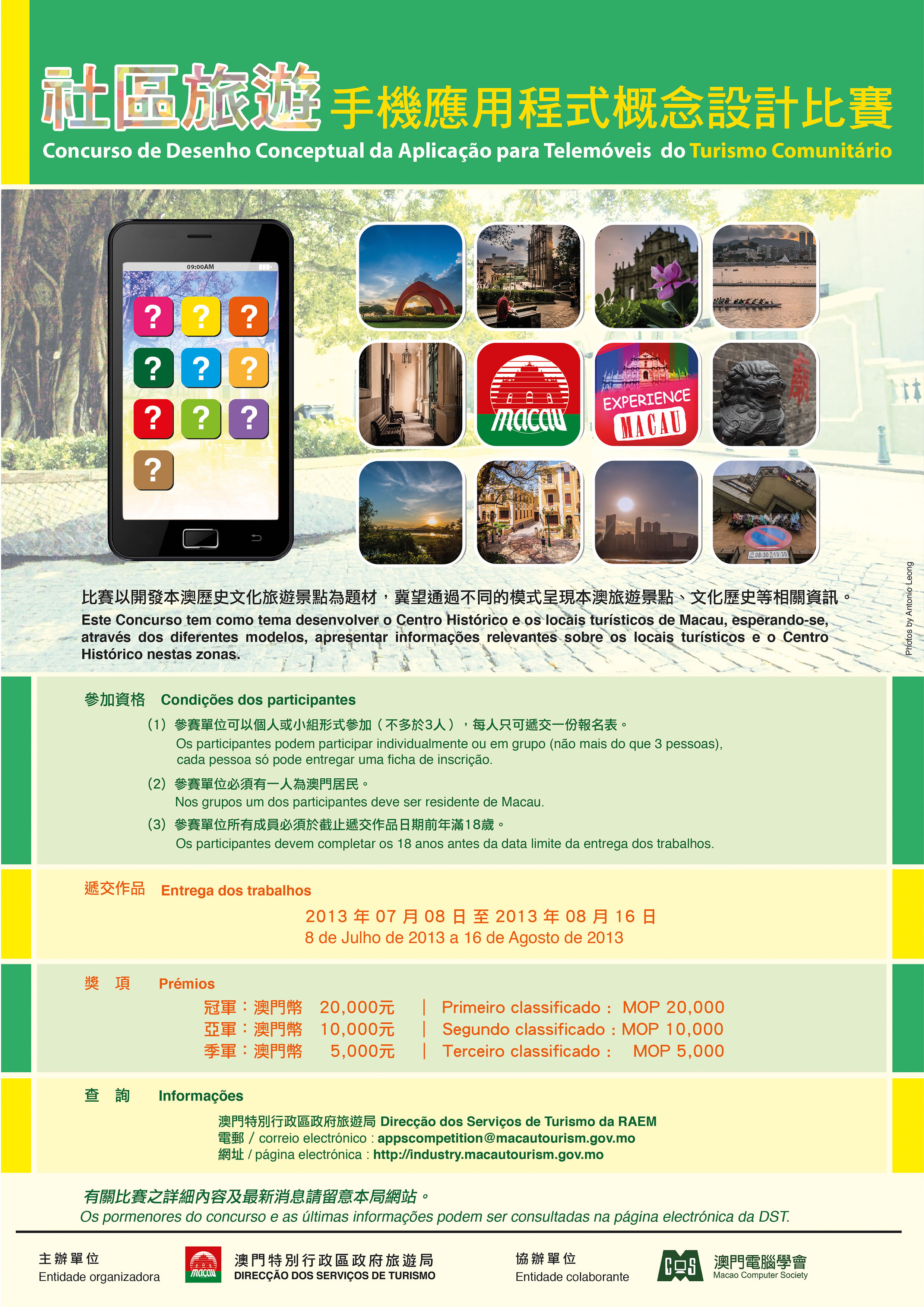 澳門特區政府旅遊局舉辦「社區旅遊手機應用程式概念設計比賽」,藉以推廣「社區旅遊發展計劃」及加深大眾對計劃的認識。同時,增加市場上介紹澳門旅遊的第三方應用程式,促進資訊科技在澳門旅遊推廣範疇的應用。